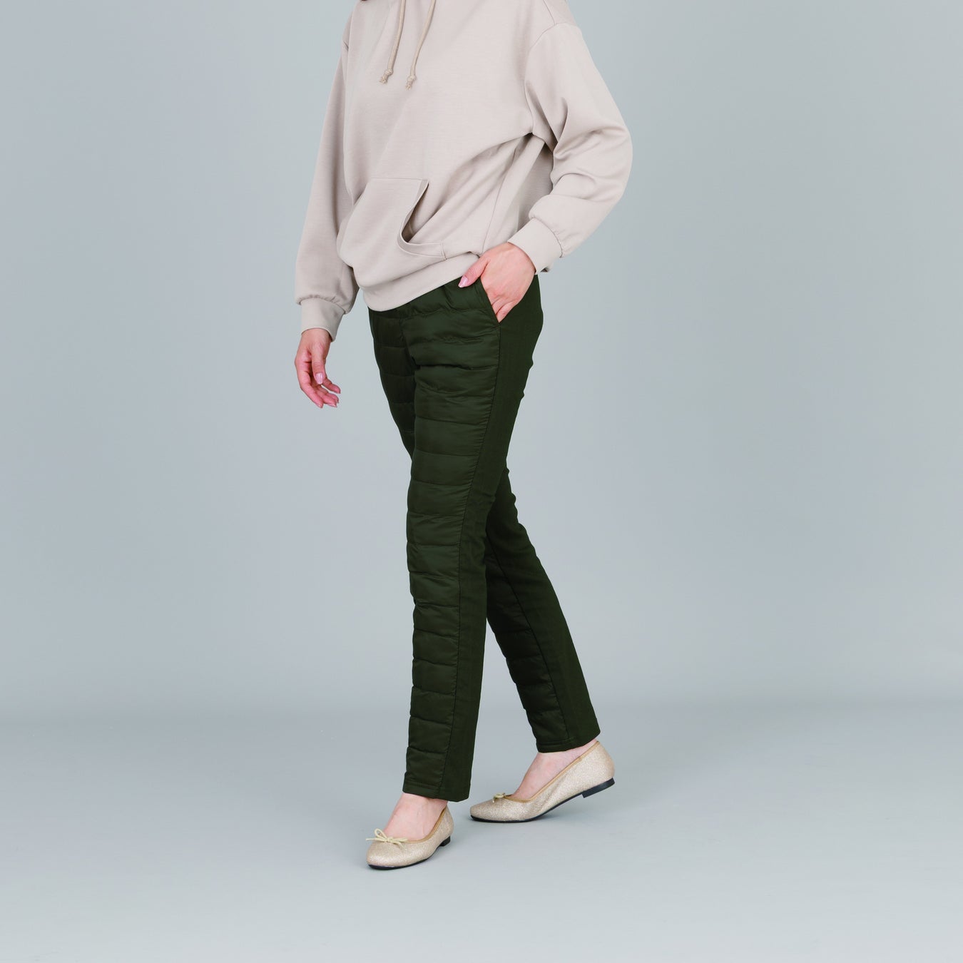 裏微起毛素材であたたかく、ウエストゴムで快適なはき心地。すっきりとしたシルエットと収納袋付きで持ち運びも便利です。