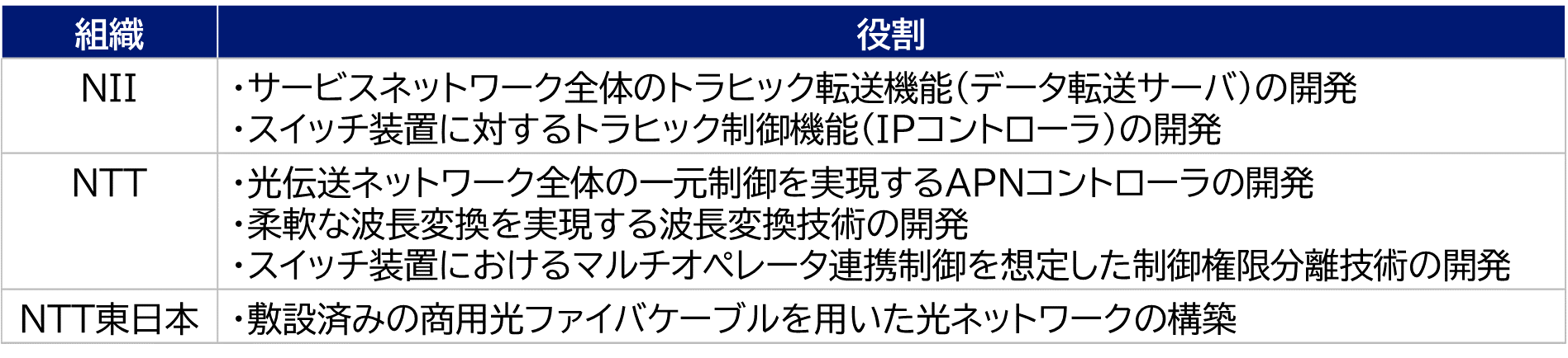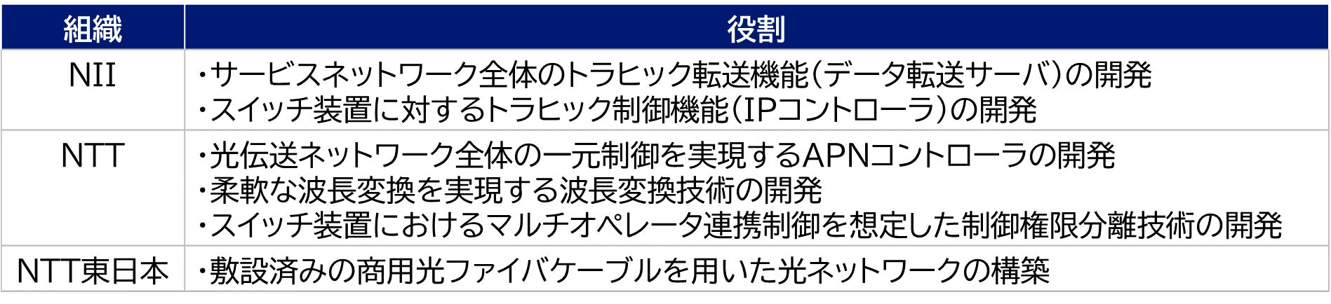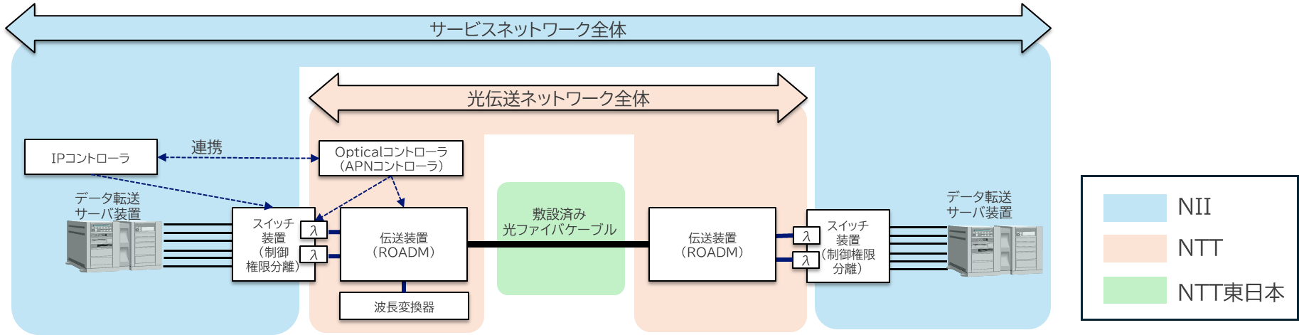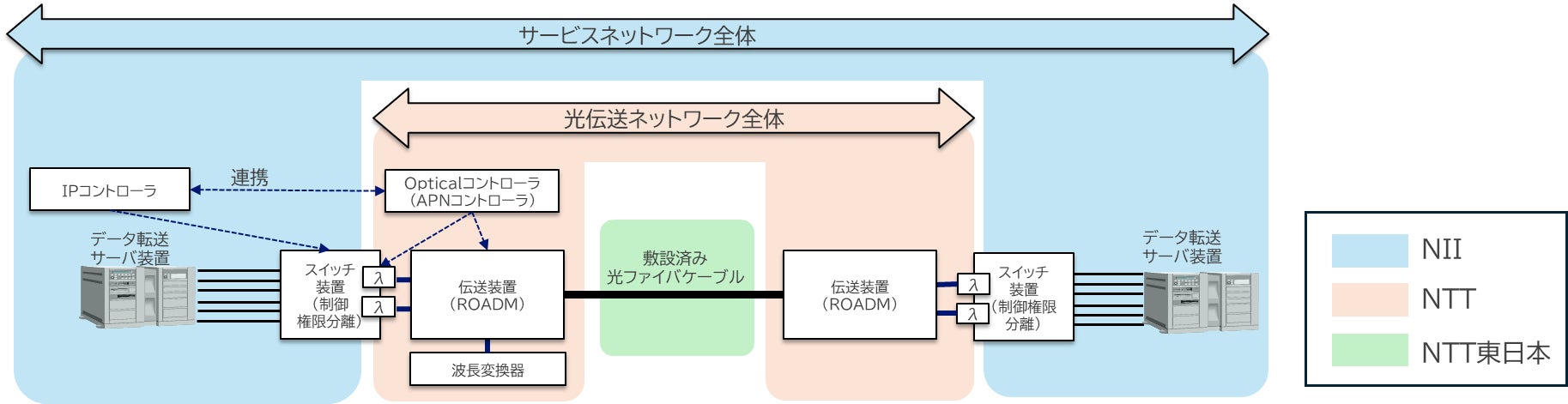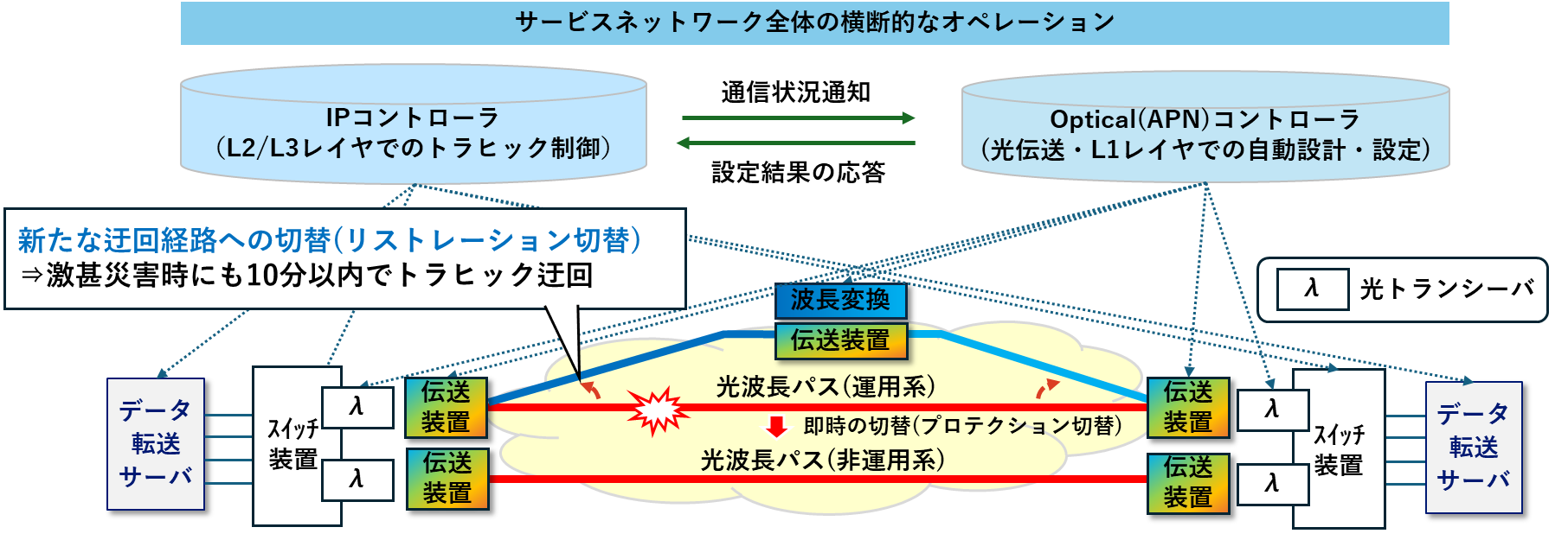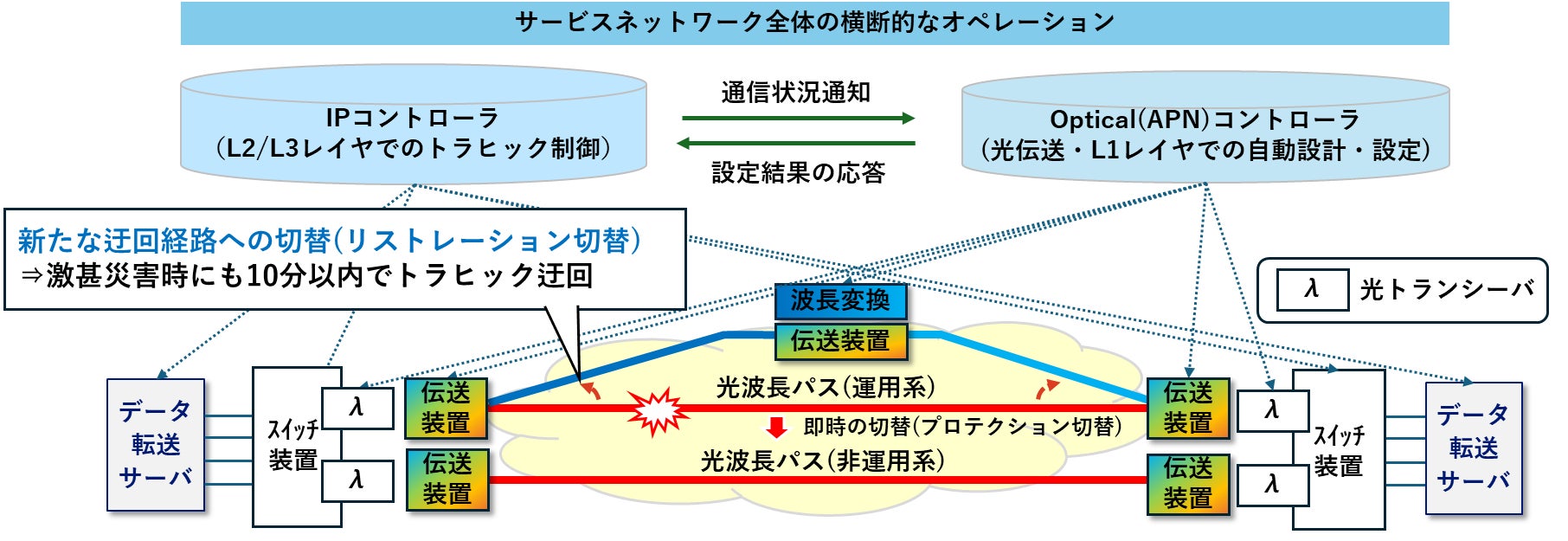 大学共同利用機関法人 情報・システム研究機構 国立情報学研究所(本所:東京都千代田区、所長:黒橋 禎夫、以下「NII」)、NTT株式会社(本社:東京都千代田区、代表取締役社長:島田 明、以下「NTT」)、NTT東日本株式会社(本社:東京都新宿区、代表取締役社長:澁谷 直樹、以下「NTT東日本」)は、激甚災害時のネットワーク維持を想定し、通信状況に応じて光伝送レイヤの設計・制御を自動化することで、波長変換を含む光波長パスにおける経路切替やオンデマンド追加設定を短時間で実現する技術の実証に、世界で初めて成功しました。本成果により、迅速な光波長パスの経路切替・追加提供が可能となり、先端技術研究を支える高信頼な通信基盤の実現と、その利便性の向上が期待されます。