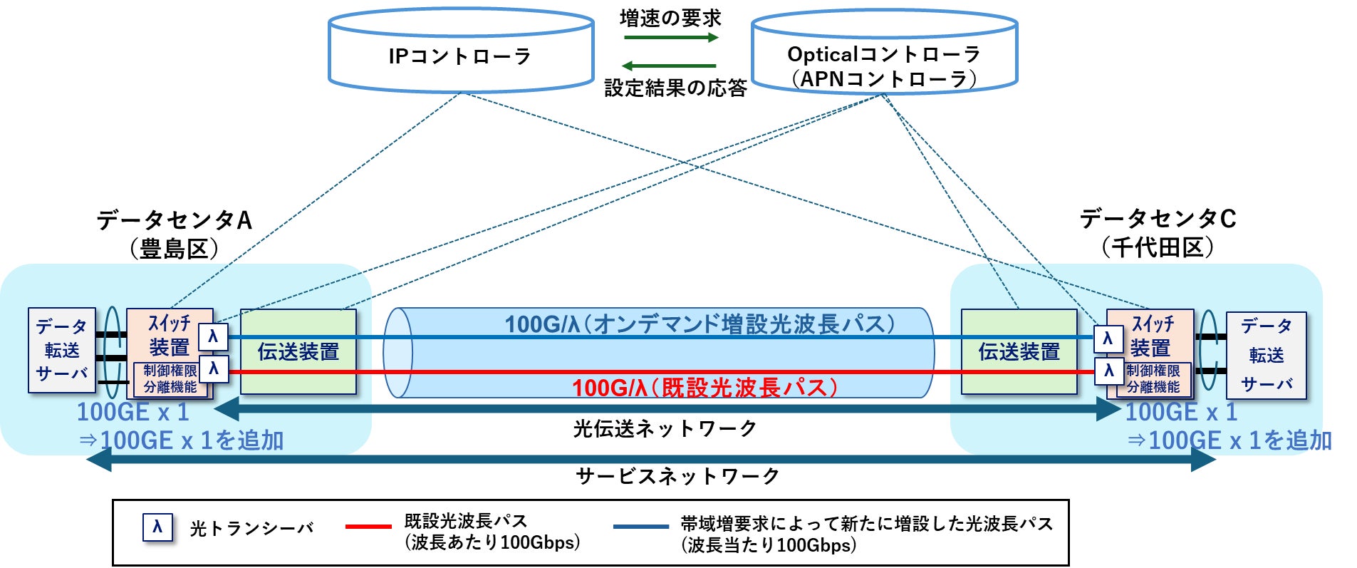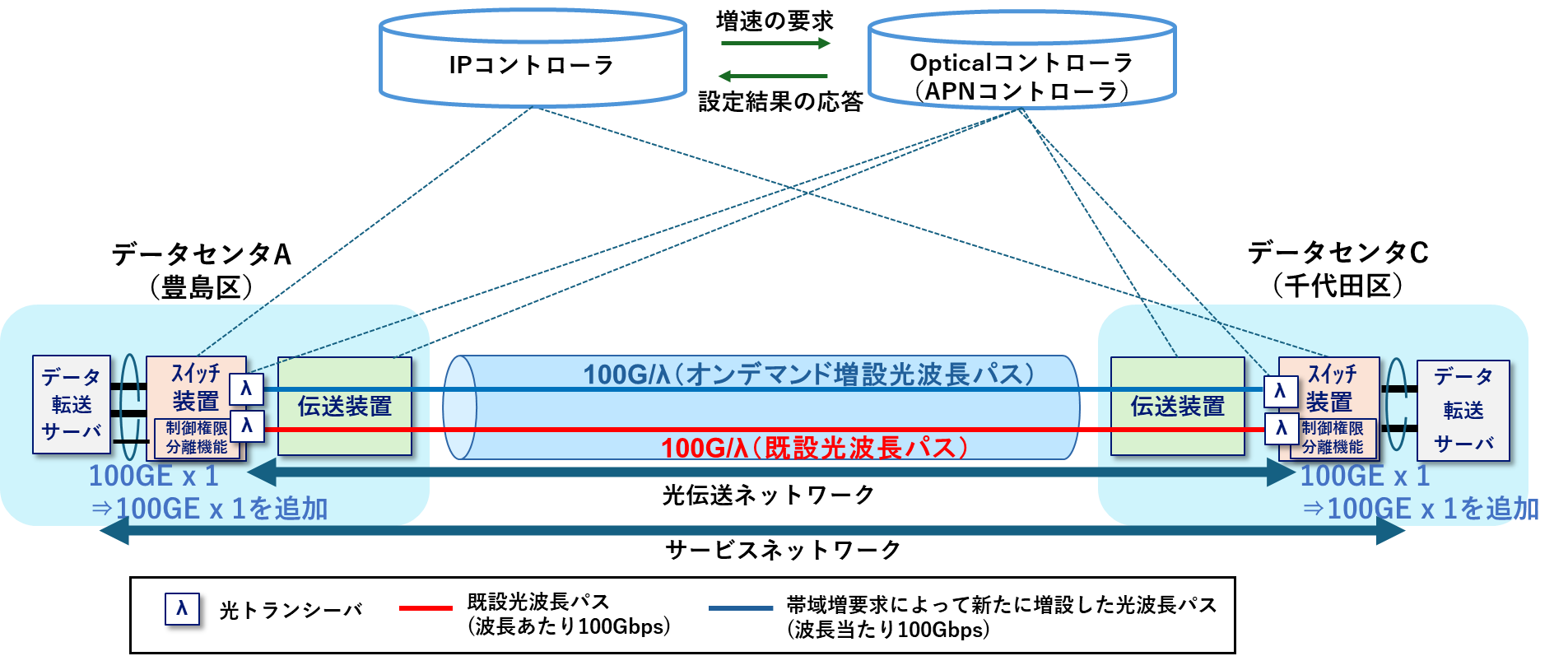 ② APNコントローラが100Gbpsの光波長パスを追加で自動設定