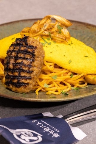 尾張たまごときぬあかりのおいしさを発信するたまごパスタ専門店「那古野パスタ」からは、手ごねハンバーグが乗った贅沢なトマトパスタにさらにふわふわのオムレツのせ!