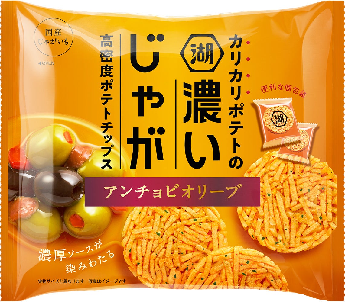 「濃いじゃが」は、カラッと揚げた細切りのじゃがいもをアンチョビオリーブの濃厚ソースと一緒に絡め、ぎっしりと丸い1枚に整えた“高密度ポテトチップス”です。食生活・価値観の変化や、多様化するライフスタイルに対応した、新たな食シーンを生み出す新時代のスナックとして誕生しました。じゃがいも1本1本が重なり合って生まれる多層食感とともに、アンチョビオリーブの濃厚な旨みがじんわりと染み渡る、食感も味わいもダブルで高密度な1枚であり、旨味がぎゅっと詰まった濃厚アンチョビに、オリーブがふわっと広がる贅沢な味わいです。パセリと赤パプリカで彩りを添えて、見た目も鮮やかに仕上げています。