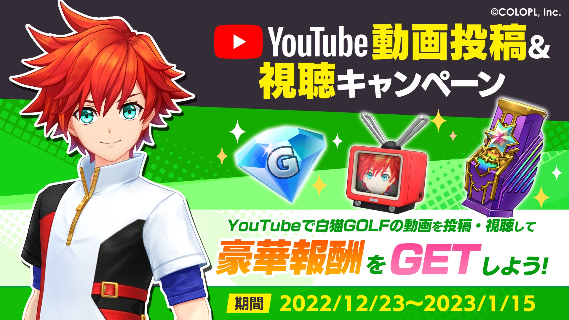 「YouTube」にて「動画投稿&視聴キャンペーン」を開催しております。『白猫GOLF』の動画を投稿・配信をしてくれた方にもれなく、ゲーム内アイテムをプレゼントいたします。また、投稿・配信された動画を視聴された方にもプレゼントがございます。視聴するほど多くの報酬が貰えますので、動画配信者の方も、視聴者の方も奮ってご参加ください。