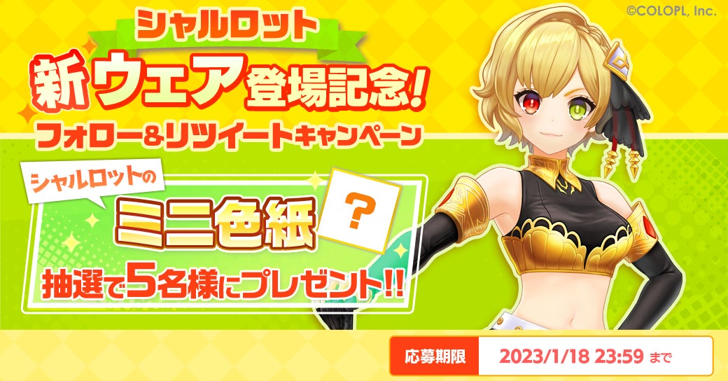 「シャルロット」の新ウェア登場を記念して、「ミニ色紙」が抽選で5名様に当たる「フォロー&リツイートキャンペーン」を開催中です。『白猫GOLF』公式Twitterをフォローして、対象のツイートをリツイートすることで応募完了となりますので、ぜひ奮ってご参加ください。