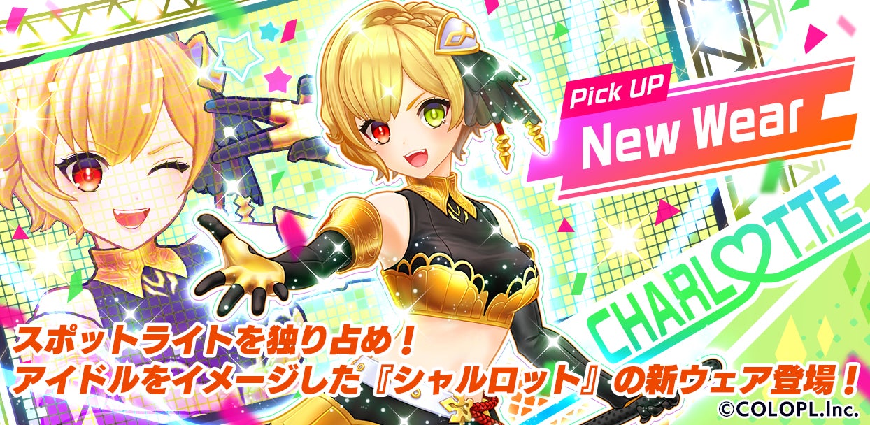 「シャルロット(CV:内田 真礼)」の新ウェア「センターオブスポット」が登場する、ピックアップ新ウェアガチャが開催中です。