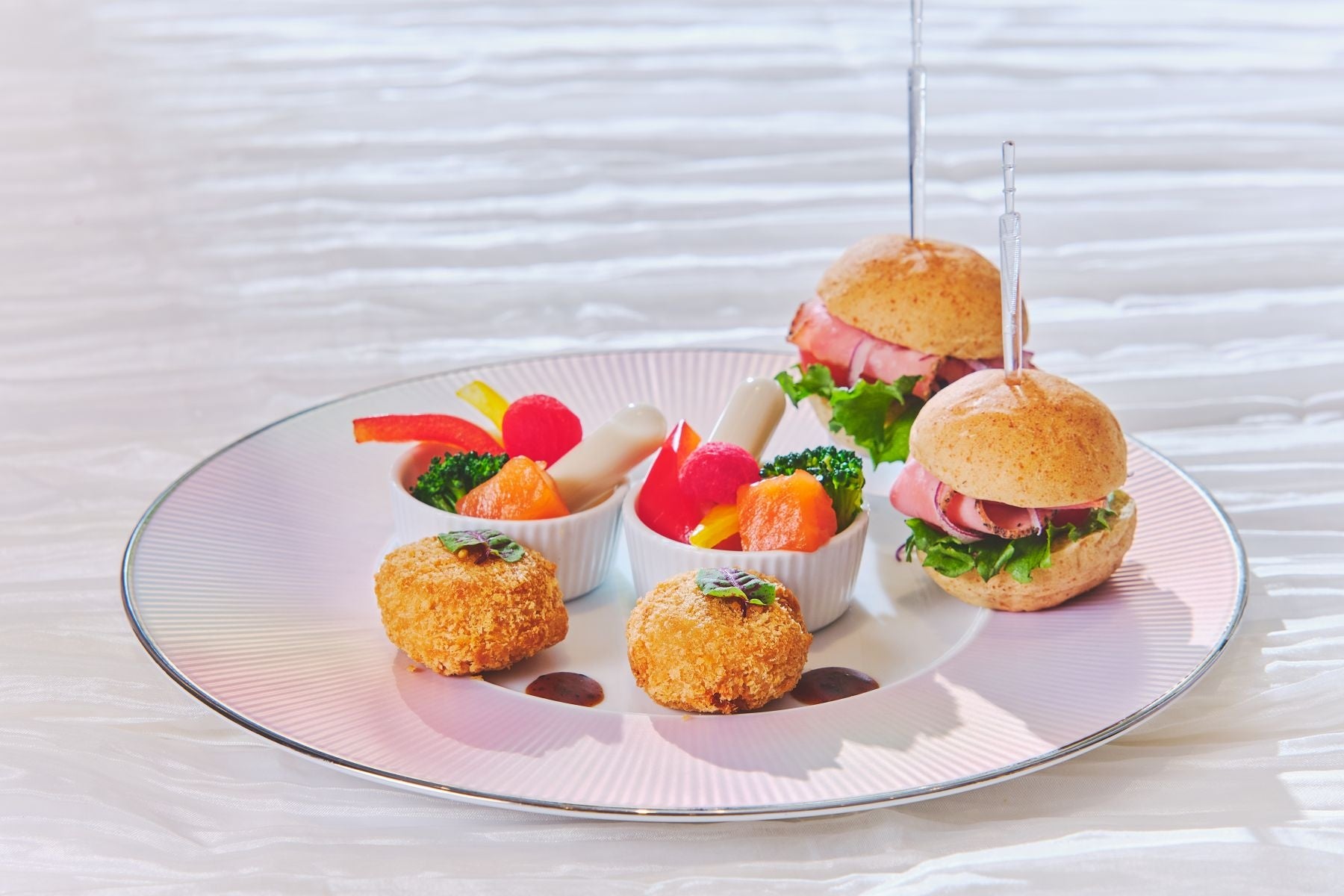 1着をお選びいただけます。(※ドレスの選択順は当日抽選となります)。会場は、煌めくシャンデリアや優雅な螺旋階段が目を引く、まるでお城のようなフォトジェニックな空間。本格的なロケーションでの撮影は、お子様が憧れのプリンセスへと変わる魔法のようなひとときを演出します。撮影の後は、パティシエ特製の「桜といちご」が奏でるアフタヌーンティーで、優雅なプリンセス気分に浸るティータイムをお過ごしください。王道の3段スタンドには、旬のいちごを贅沢に添えた桜色のスイーツ。さらに、ミニハンバーガーやライスコロッケといったボリューム満点のセイボリーも並び、お食事としても存分にお楽しみいただけます。卒園や進級という新たな門出を迎えるこの春、ホテルの上質なおもてなしとパティシエ特製のアフタヌーンティーで特別な一日をお過ごしください。(※ドレスの着用は撮影時のみとなります。撮影後は私服にお着替えいただき、ゆったりとアフタヌーンティーをお楽しみください。)