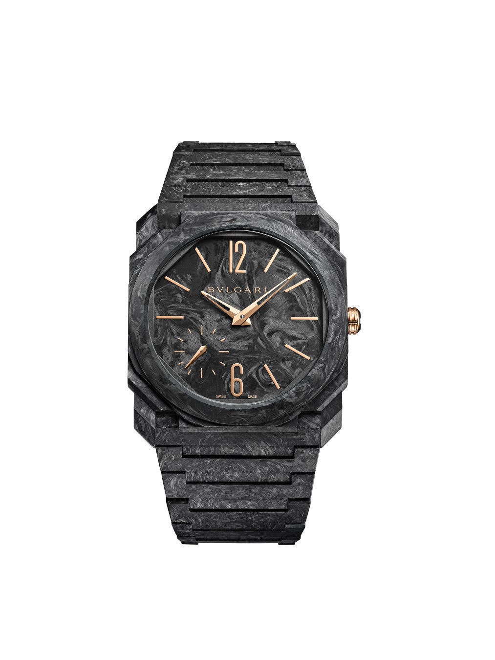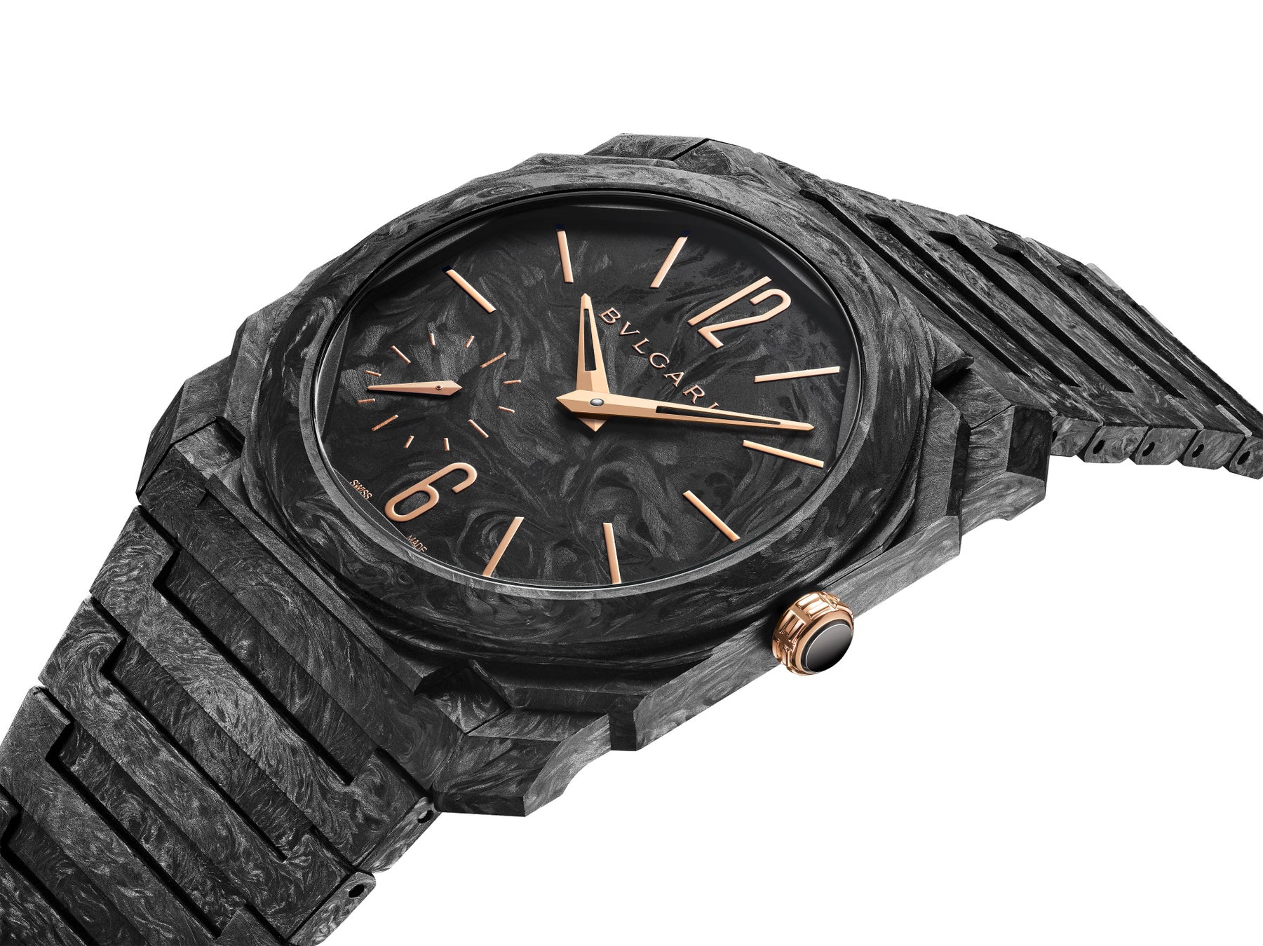 スモールセコンドまたはパーペチュアル カレンダーが搭載された新しい「オクト フィニッシモ カーボンゴールド」のタイムピースは、ゴールドとカーボンを組み合わせることで「オクト フィニッシモ」のシックな表情と感覚をまったく違った形で表現しました。ケース、ストラップ、ダイヤルには極めて軽量なマット仕上げのアンスラサイトカラーのカーボンを使用しています。ハイテク素材カーボンを背景にしたゴールドのディスプレイのパーツとクラウンが高級感あふれるコントラストを生み出しています。1993年に始まった2つの素材の組み合わせという手法には新たな素材と組み合わせの可能性を探求するブルガリの姿勢が現れています。