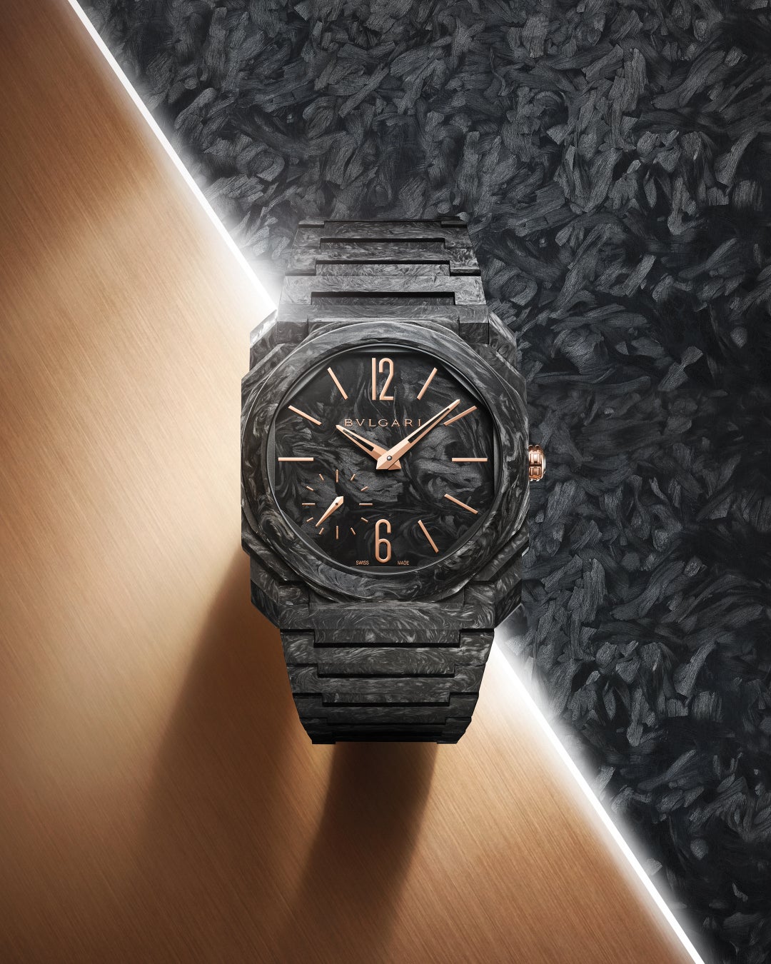 このたびブルガリは新しい「オクト フィニッシモ」のふたつのタイムピース、「オクト フィニッシモ カーボンゴールド」と「オクト フィニッシモ カーボンゴールドパーペチュアル カレンダー」を発表します。2014年より8つの世界記録を打ち立てブルガリの大きな節目となった2017年記録達成の「オクト フィニッシモ オートマティック」と2021年記録達成の「オクト フィニッシモ パーペチュアル カレンダー」が、アンスラサイトカラーのハイテク素材カーボンにゴールドのラグジュアリーなタッチを添え生まれ変わりました。常識を覆す素材の融合をブルガリが初めて発表したのは1993年、時計を手掛けるジュエラーの視点で素材を見極められるからこそ実現できました。「オクト フィニッシモ カーボンゴールド」と「オクト フィニッシモ カーボンゴールドパーペチュアル カレンダー」は、現代のウォッチメイキングのルールを再定義する希少なモデルです。スタイルと革新が生み出した大胆なタイムピースは、ウォッチメイキングの歴史に一石を投じるモデルといえます。