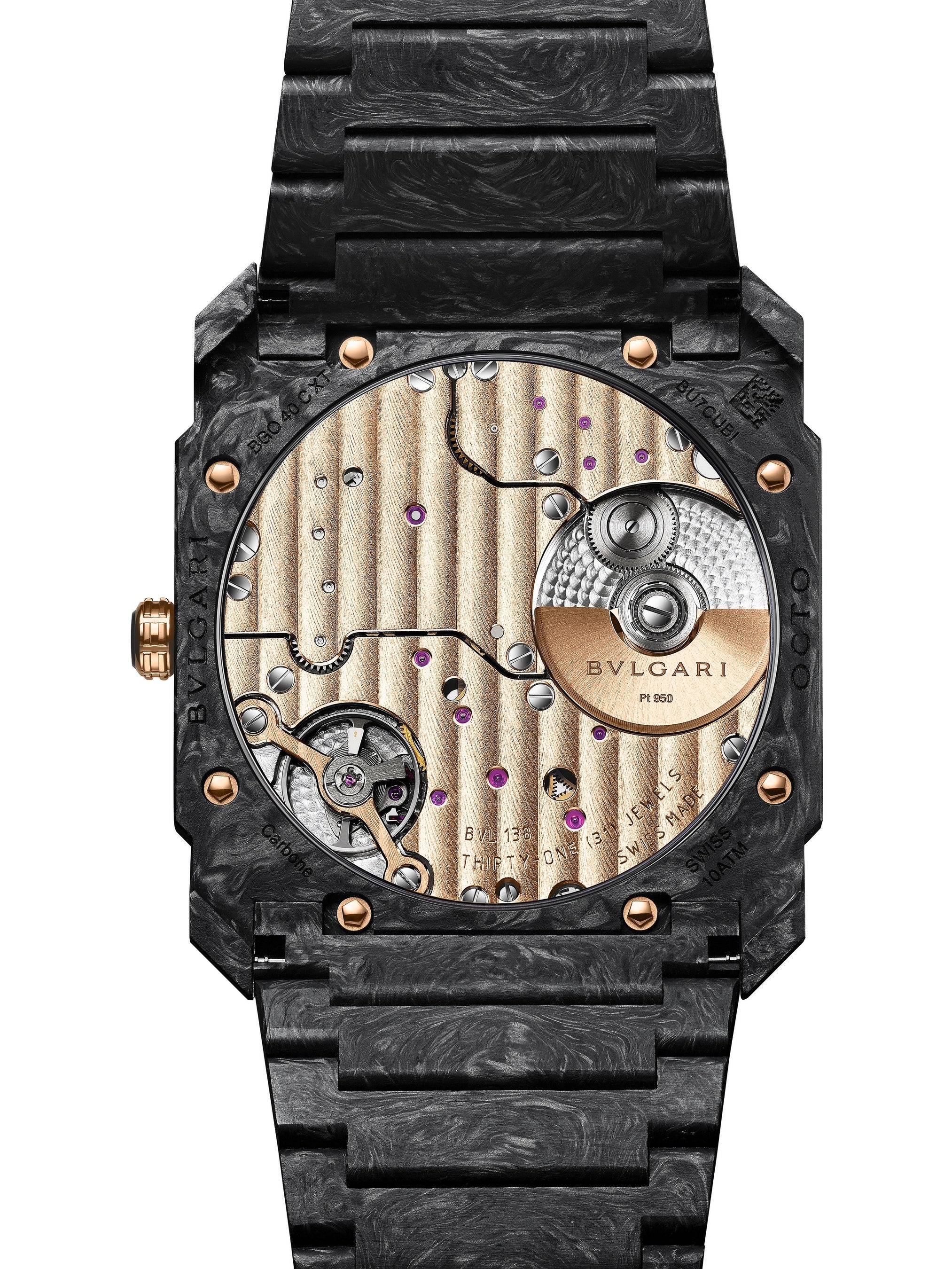 ブルガリが培ってきた「Estetica della Meccanica(機構の美学)」は「オクト フィニッシモ カーボンゴールド」のシースルーのケースバックにも表れています。8本の貴金属のネジで固定されたカーボン製ケースバックからはコート・ド・ジュネーブの装飾があしらわれたピンクゴールドのブリッジとピンクゴールドを施したプラチナで作られた回転垂が描く鮮やかなコントラストを覗くことができます。エッジの効いた、他に類のない大胆な美学はテクニカルな面でもインパクトを与えます。そしてこれこそが、ブルガリの最も正統なスタイルなのです。