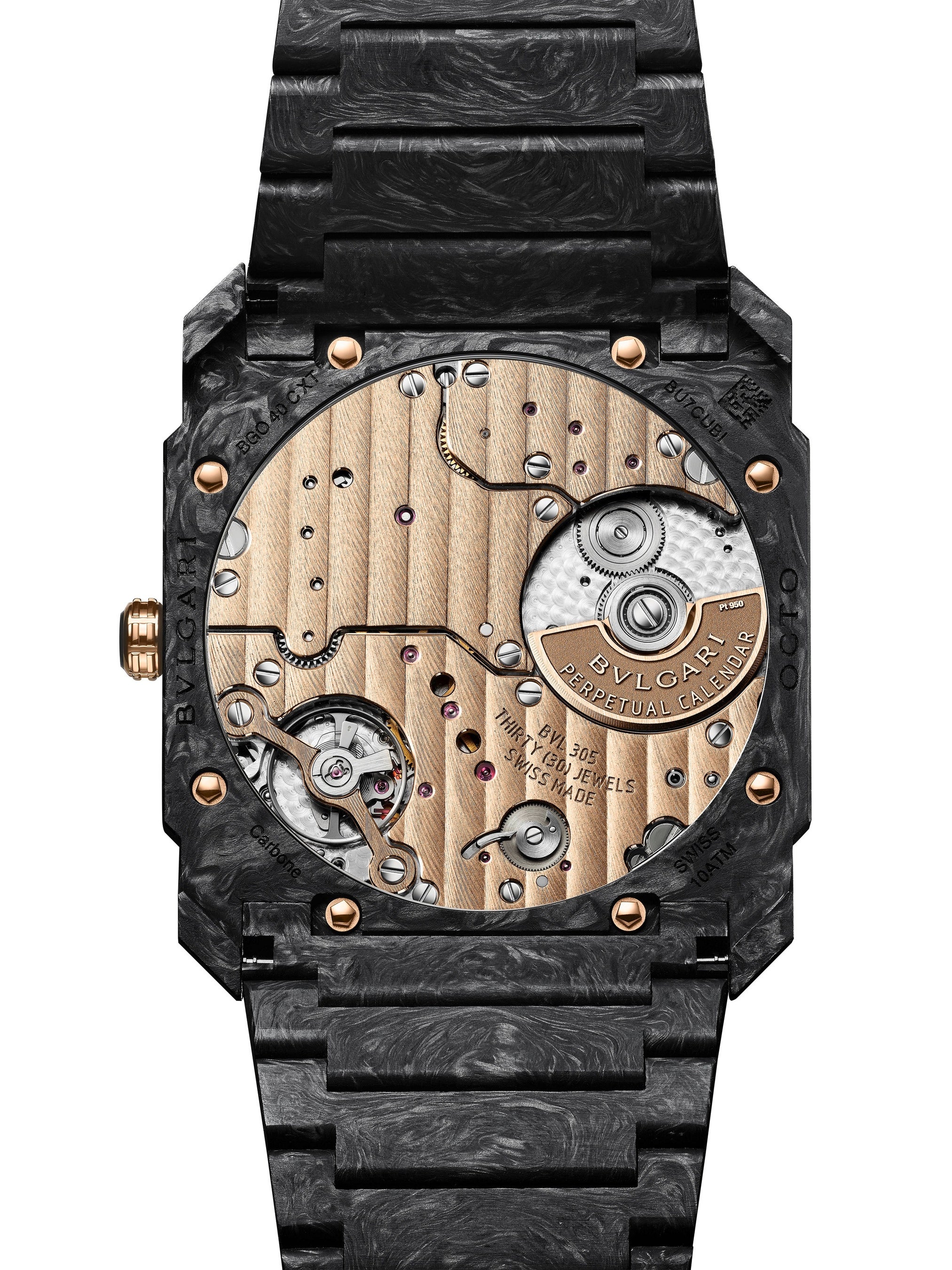 歴史的建造物がベースとなった「オクト フィニッシモ」は丸型のベゼルと8角形の時計の文字盤を組み合わせ、デザイン全体と調和させているのが特徴です。計算された壮麗さの中に引き立つ厳格なライン、これがまさにブルガリのスタイルです。「オクト フィニッシモ」の超絶的な精巧さは深く根付いた規範を再考し限界を押し広げる力を幾度となく証明してきたマニュファクチュールが持つ卓越したウォッチメイキングの技術を物語っています。2021年のジュネーブ ウォッチ グランプリにおいて金の針賞を受賞した「オクト フィニッシモ パーペチュアル カレンダー」は世界最薄という記録を毎年塗り替えてきた「オクト フィニッシモ」の7代目のモデルです。ゼロから再設計されたキャリバーBVL305はわずか2.75mmの驚異的な薄さを実現しました。この新しいカーボンバージョンモデルは2100年まで調整不要な超薄型のパーペチュアル カレンダーコンプリケーションを搭載しており揺るぎないコンテンポラリーな表情を湛えています。
