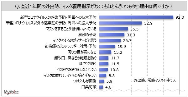 ■外出時に常時マスクを使う人の使用理由は、「新型コロナウイルスの感染予防・周囲への拡大予防」が9割強、「コロナ以外の感染症の予防・周囲への拡大予防」が5割強。「習慣になっている」「風邪の予防」が各30%台、「マナーだと思う」が3割弱