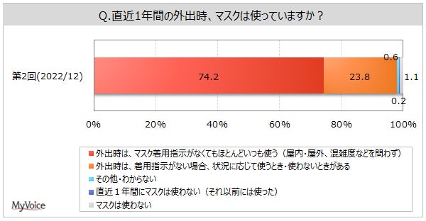マイボイスコム株式会社(東京都千代田区、代表取締役社長:高井和久)は、2回目となる『マスクの利用』に関するインターネット調査を2022年12月1日~5日に実施しました。調査結果をお知らせします。
