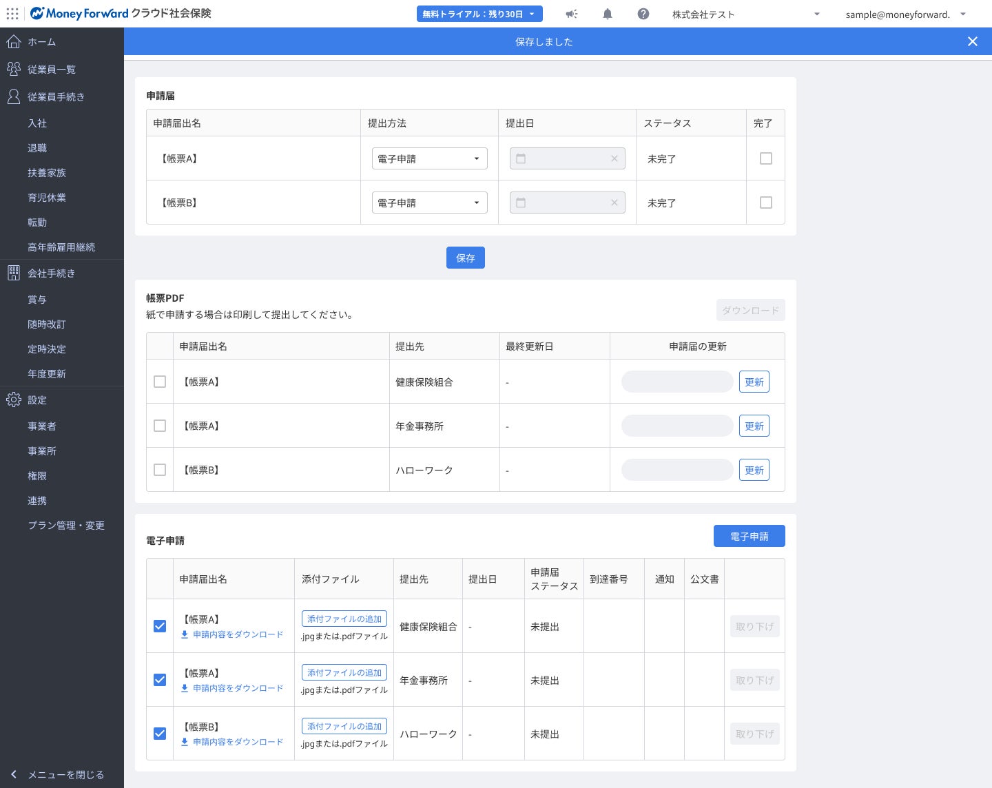 こうした中、『マネーフォワード クラウド社会保険』において、社会保険の電子申請義務化への対応を強化するため、マイナポータルとの連携機能を提供開始しました。今回の連携機能により、健康保険組合への電子申請が可能になります。入退社手続きの際に必要な健康保険被保険者資格取得届や、健康保険被保険者資格喪失届、賞与支払いの際に必要な健康保険被保険者賞与支払届などの電子申請を、クラウド上で行うことができます。