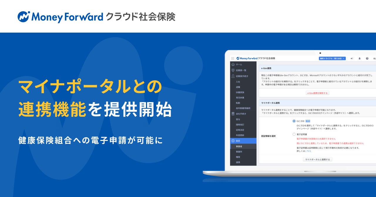 株式会社マネーフォワードが提供する『マネーフォワード クラウド社会保険』において、健康保険組合への電子申請が可能になる、マイナポータルとの連携機能を提供開始しました。これにより、従業員の入退社や賞与支払い等において必要な健康保険組合への電子申請を、クラウド上で行うことが可能になり、社会保険手続きを軽減することができます。