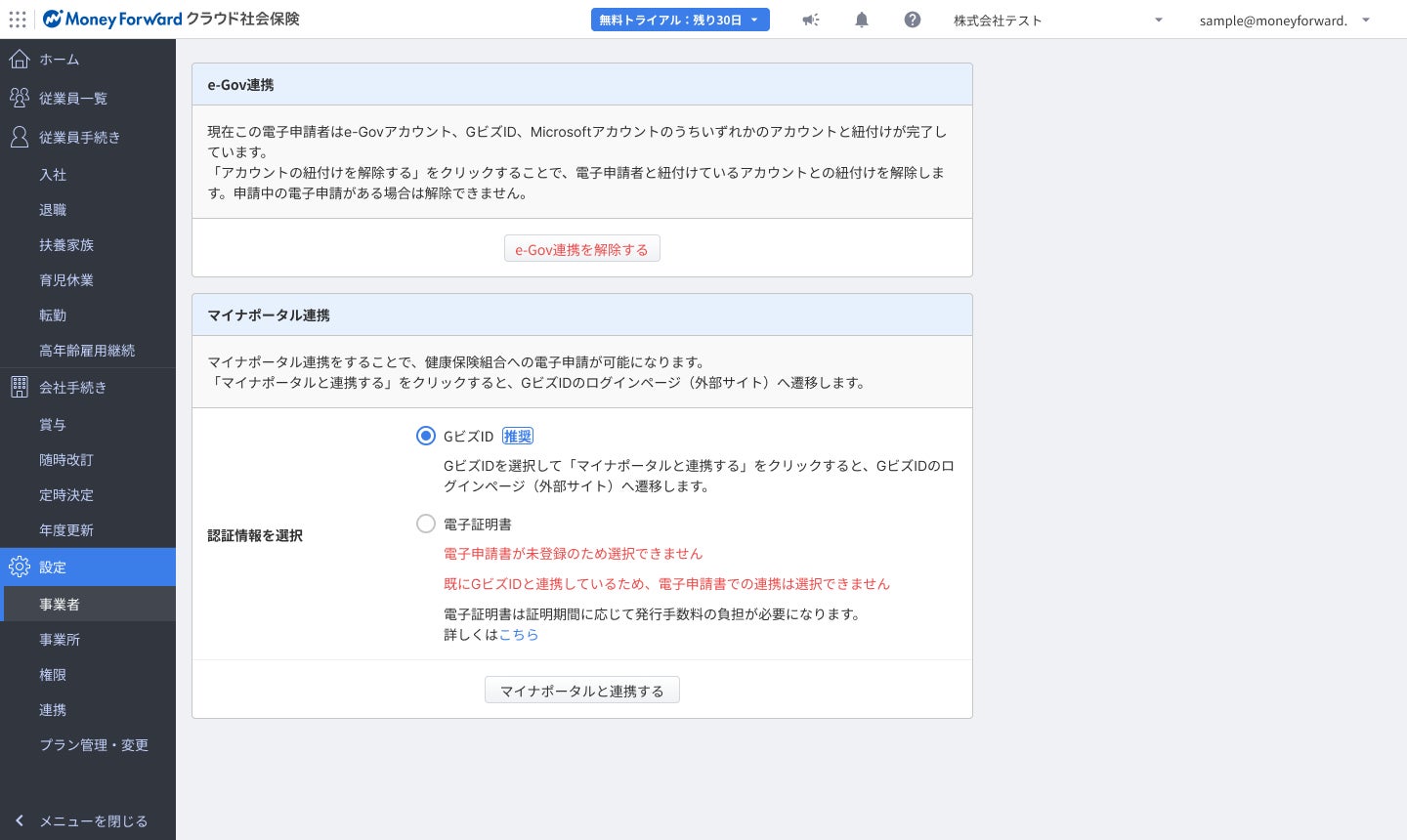 1.『マネーフォワード クラウド社会保険』の「電子申請設定」のマイナポータル連携から、「GビズID」または「電子証明書」を選択し連携します。