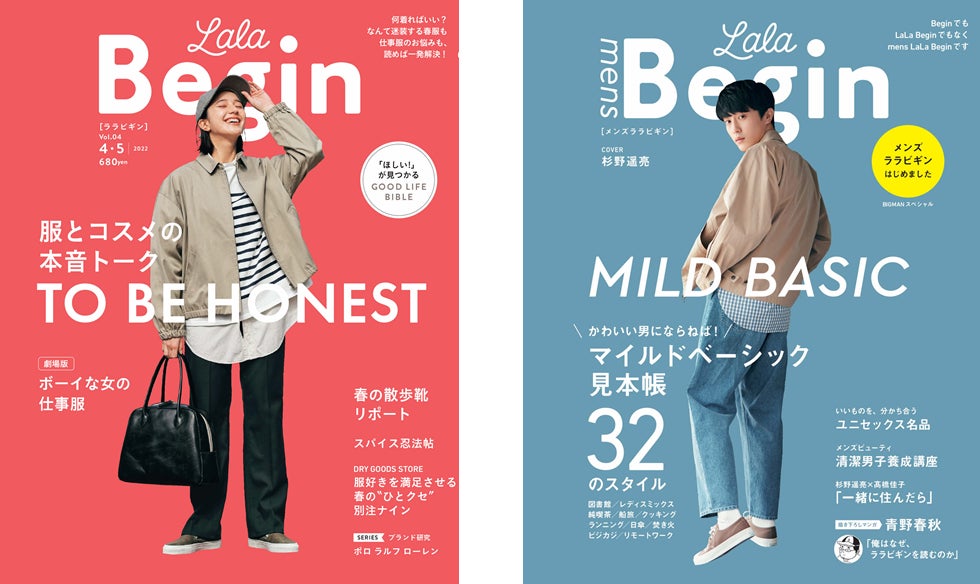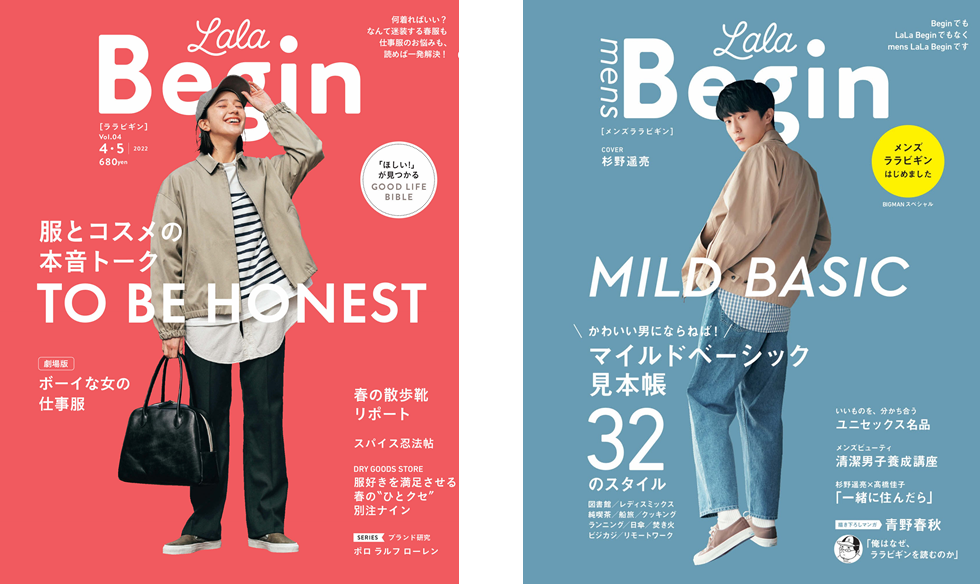 男性モノ&ファッション誌『Begin』の妹雑誌としてスタートした『LaLa Begin』。3月11日(金)発売の2022年 4・5号で9年目を迎えます。メイン読者の30~40代女性だけでなく、パートナーや家族と一緒に楽しめるエイジレス、ジェンダーレス、タイムレスな誌面に共感の声をいただいています。今回は本誌発売の2日前、3月9日(水)にムック『mens LaLa Begin』も刊行。『LaLa Begin』の読者から「パートナーと二人で愛読している」「男性でも楽しめる」という声を多くいただくようになり、初となるメンズ版の刊行にいたりました。2誌ともに女性、男性の枠を超えて楽しむことのできる、ユニセックスマガジンとなっています。