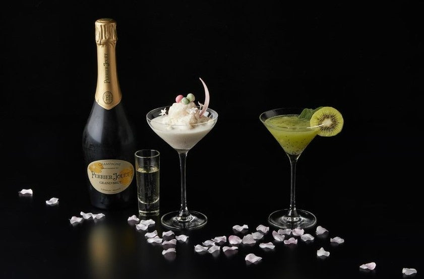 ウェスティンホテル横浜のシグネチャーカクテル「ヘブンリーベッド」に桜餡のシャーベットと「ペリエ・ジュエ」のシャンパンを合わせたシャンパンカクテル。お好みでシャンパンを注いでお召し上がりください。