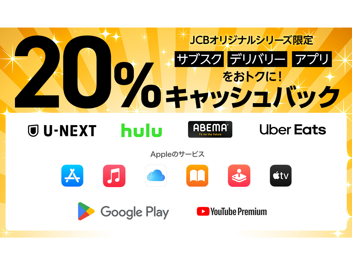 期間中にJCBオリジナルシリーズへの新規入会とMyJCBアプリへのログインをすることで、以下対象利用先での利用金額のうち20%(最大5,000円)をキャッシュバック。 <対象利用先> ・U-NEXT ・Hulu ・ABEMA ・Uber Eats ・App Store ・Apple Music ・iCloud+ ・Apple Books ・Apple Arcade ・Apple TV+ ・Google Play ・YouTube Premium ・YouTube Music ※Google Play、YouTube Premium、YouTube MusicはGoogle LLC の商標です。 |