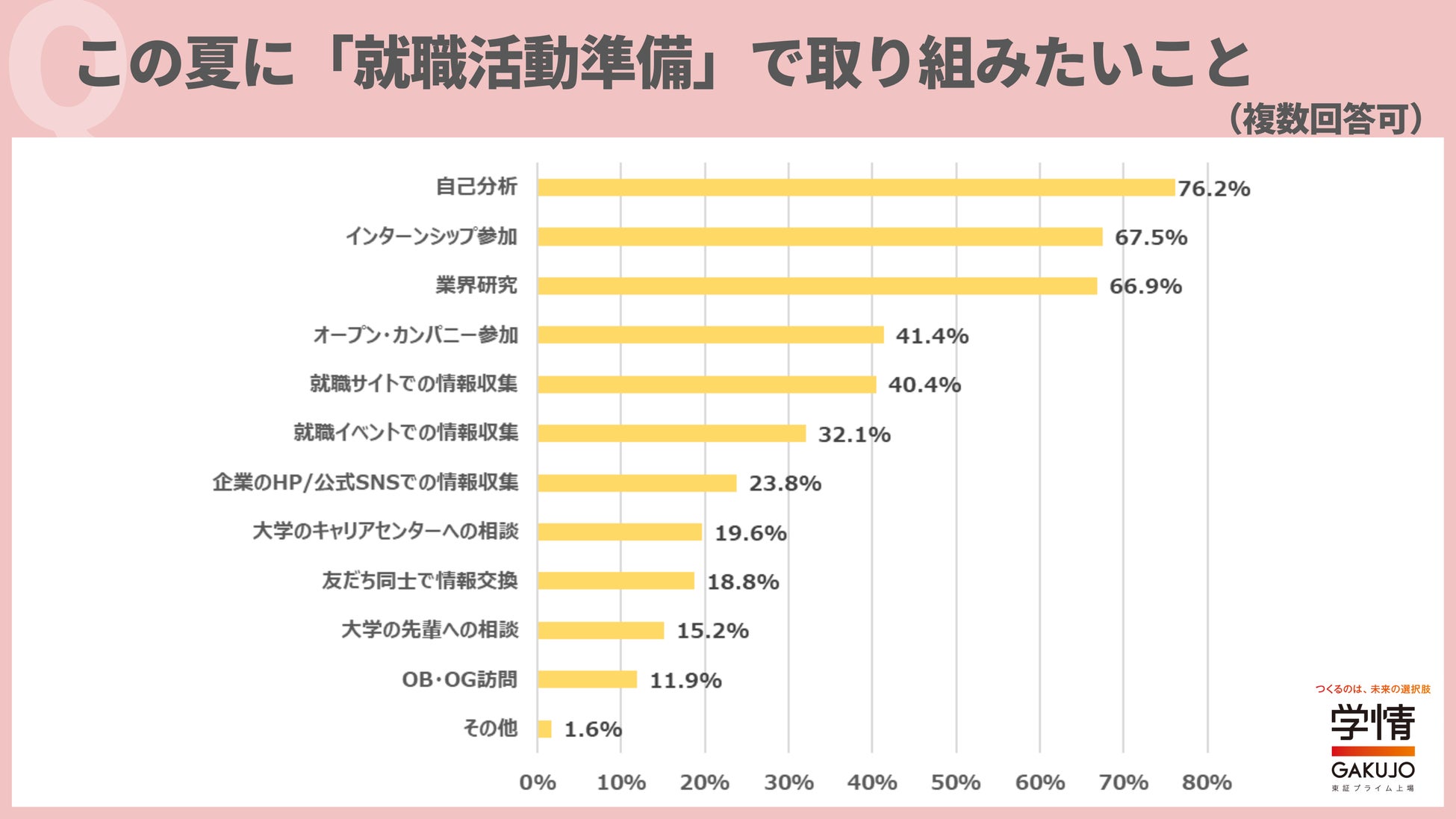 夏休み中に「就職活動準備」で取り組みたいことは、「自己分析」が76.2%で最多。次いで、「インターンシップ参加」67.5%、「業界研究」66.9%が続きました。「選考が始まる前に就活の軸を定めたい」「夏休み中に就活を進め、できれば早期選考にも繋げていきたい」「インターンシップに参加する企業を中心に業界・企業研究を進めたい」「この夏休みでどれだけ情報を集められるかが鍵になると考えている」といった声が寄せられました。