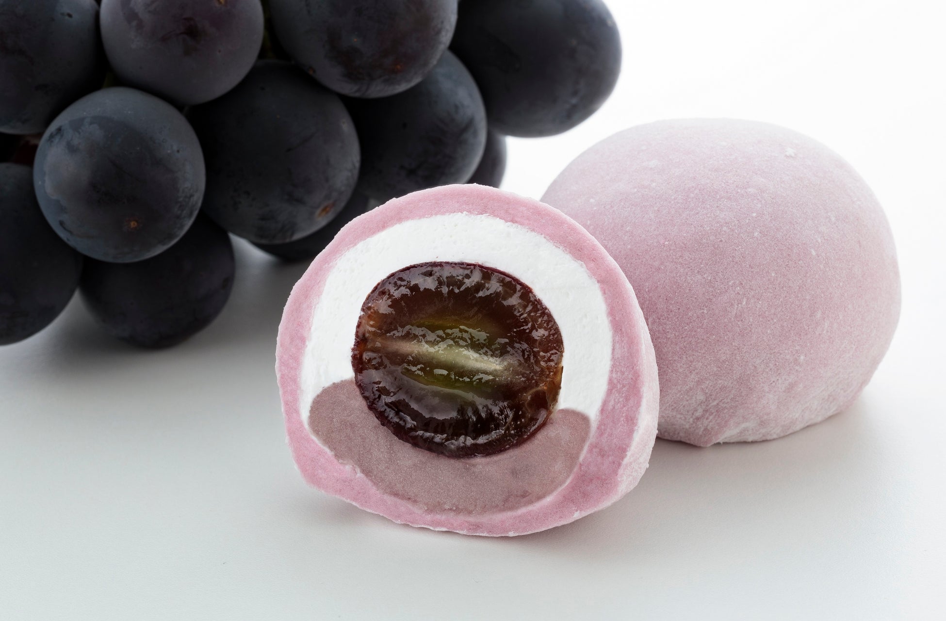 ひとつひとつ丁寧に皮をむいた種なし巨峰と、ぶどう餡をぶどう果汁で練り上げた餅生地で包みました。