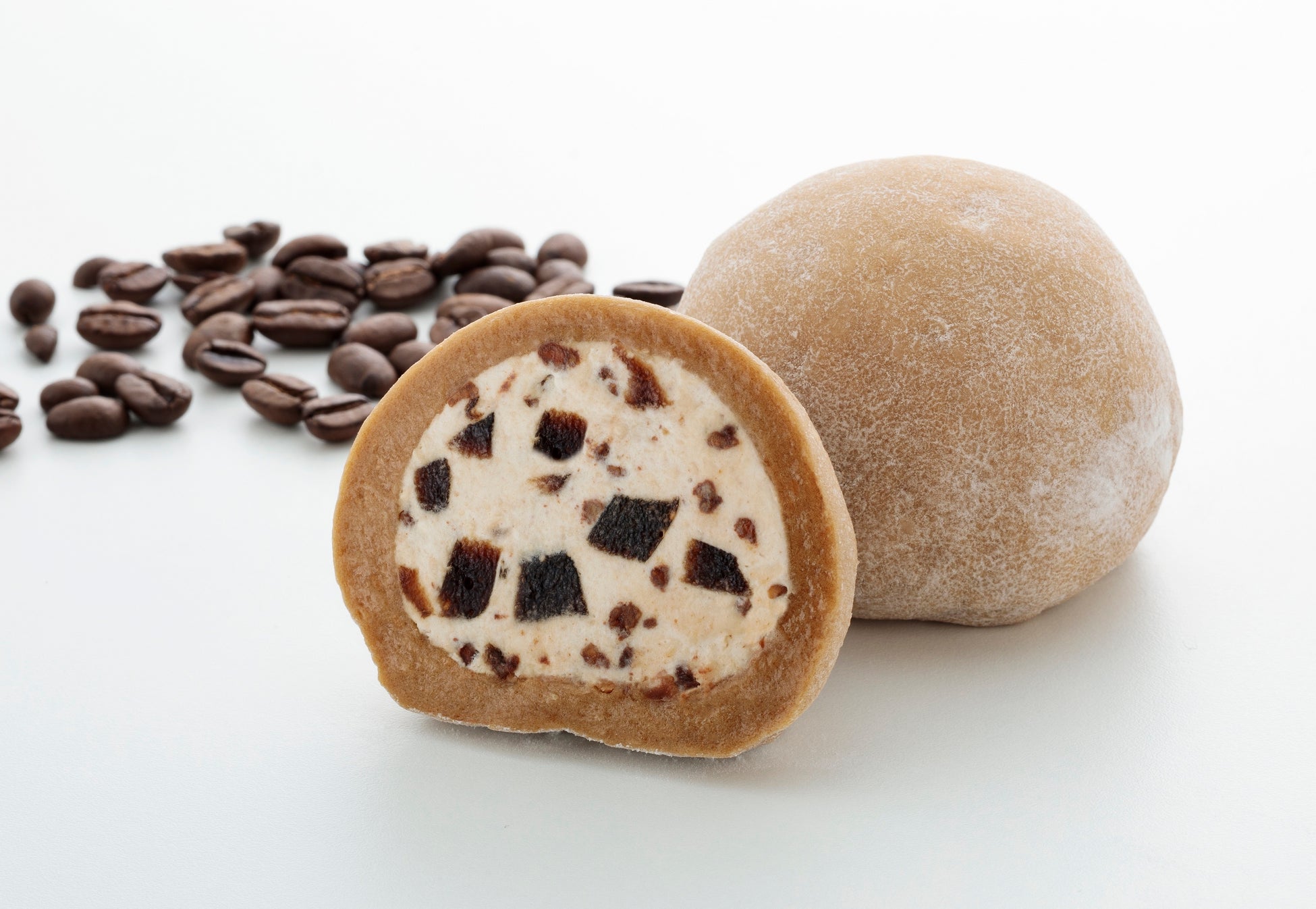 カリカリにキャラメリゼしてチョコレートをまとわせたアーモンドと、コーヒーゼリーを混ぜた生クリームを包みました。