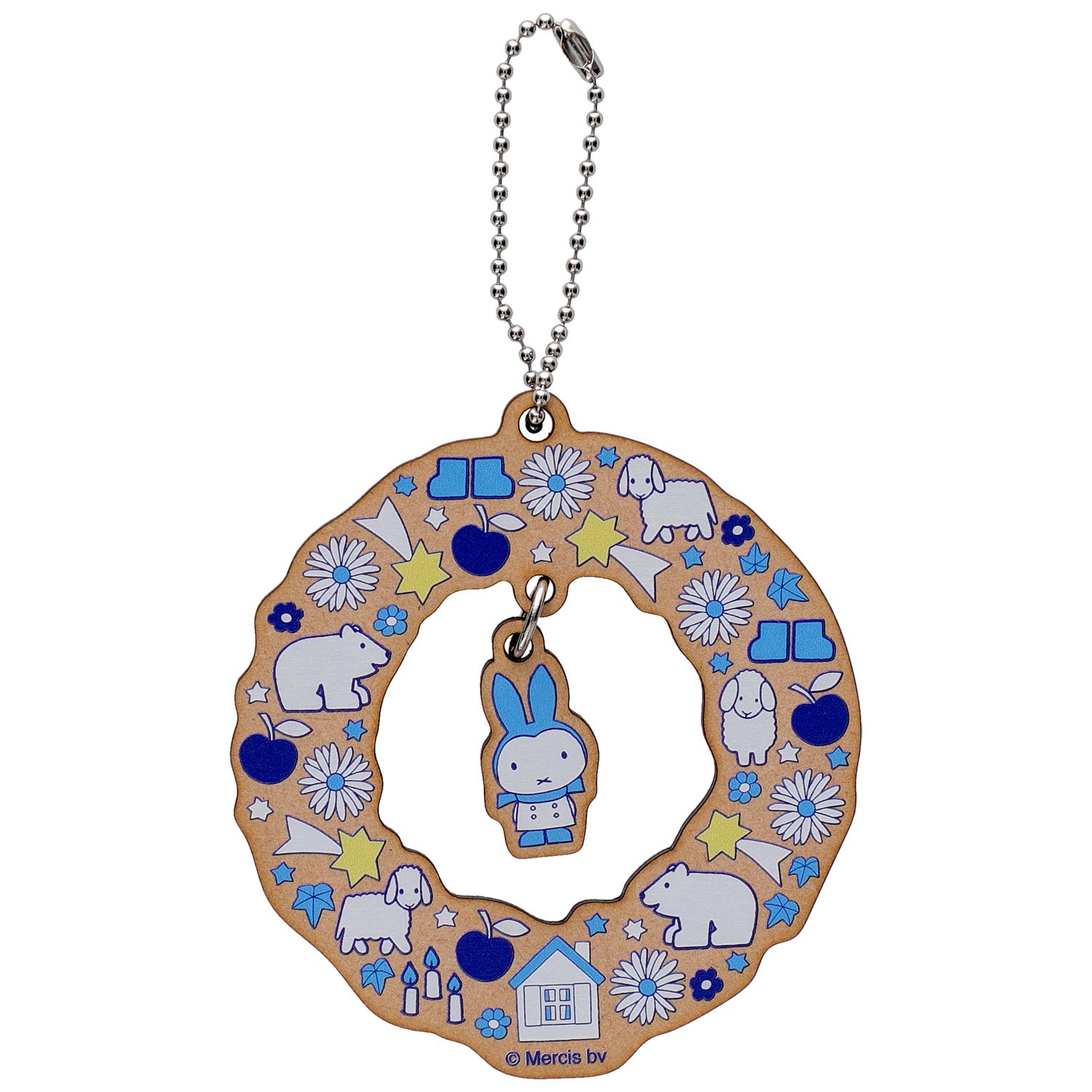 お花のリースのようなデザインに白い動物たちとミッフィーをあしらった木製キーホルダーです。中央のミッフィーがゆらゆら揺れるのがかわいらしく、バックなどにつけるチャームとしてはもちろん、クリスマスツリーのオーナメントとしてもご使用いただけます。
