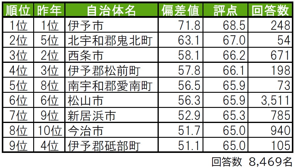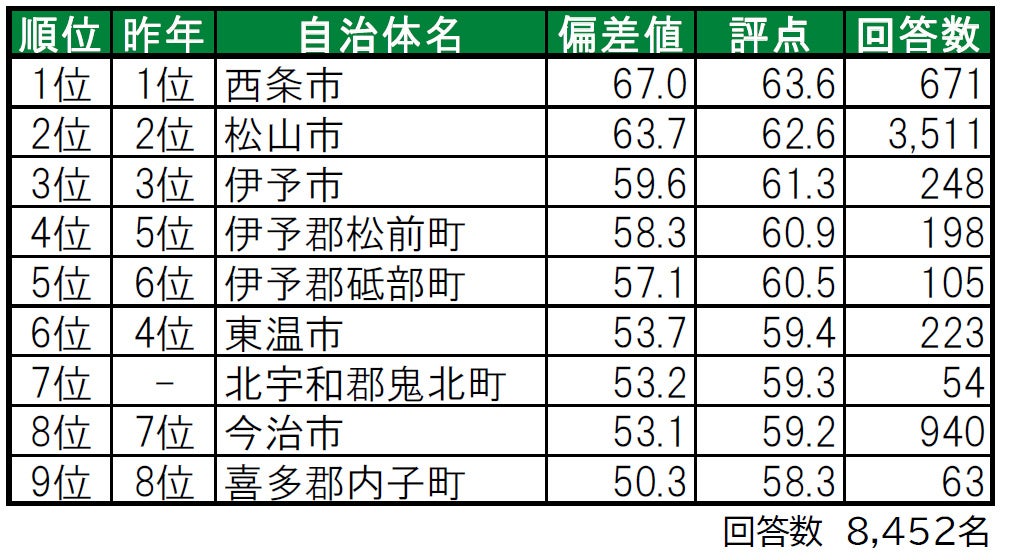 西条市が、3年連続で1位に輝きました。2位は松山市、3位は伊予市で、いずれも2年連続でのランクインです。その他、トップ9で今回初登場の自治体は、7位の北宇和郡鬼北町(きたうわぐん きほくちょう)で、昨年は累計回答数が50名未満でランキング集計対象外でした。