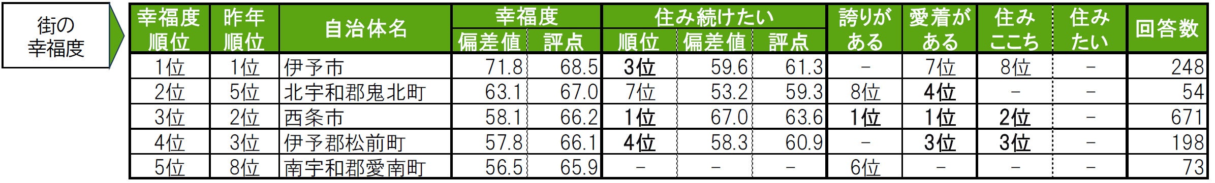 街の幸福度1位は4年連続で伊予市。2位北宇和郡鬼北町、3位西条市。