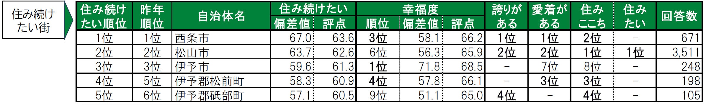 住み続けたい街1位は3年連続で西条市。2位と3位は2年連続で、2位松山市、3位伊予市。