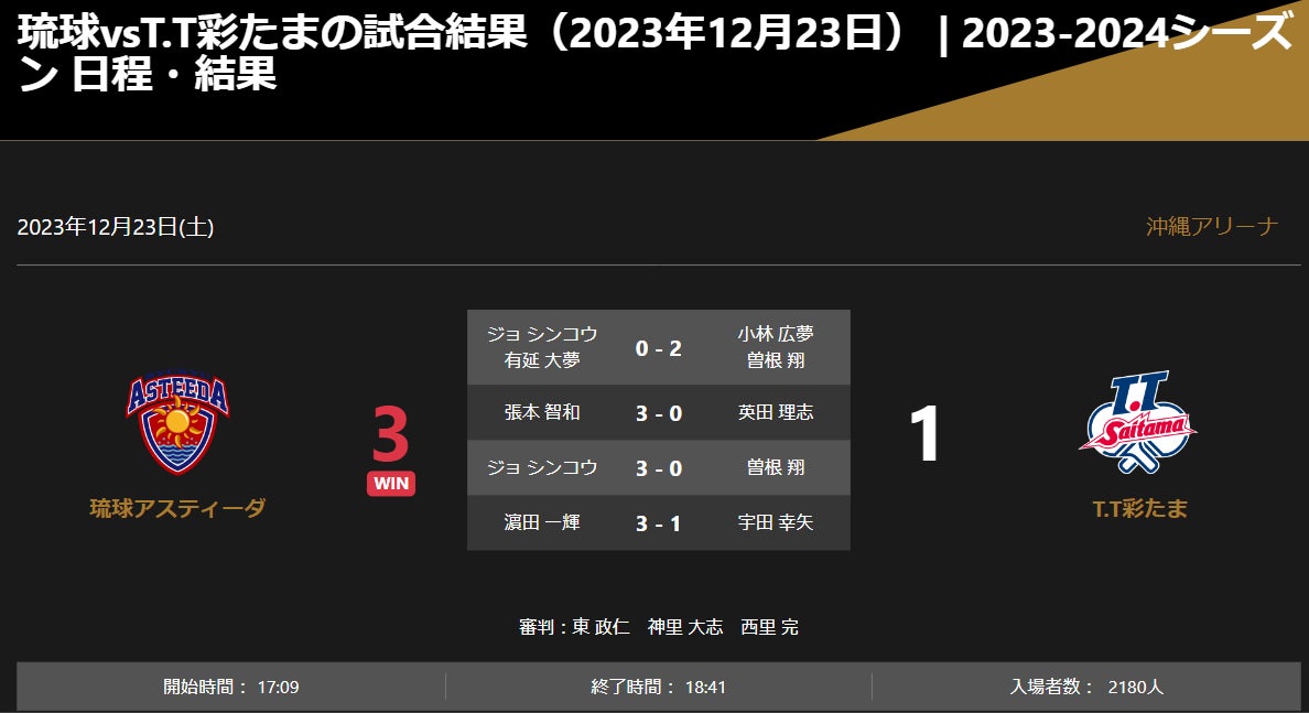 ノジマTリーグ 2023-2024シーズン 公式戦 12月23日開催 琉球アスティーダvsT.T彩たま試合結果