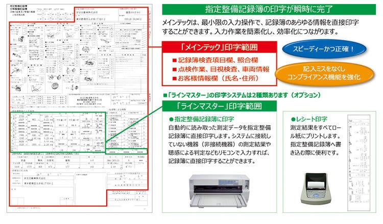 指定整備記録簿の印字が瞬時に完了メインテックは、最小限の入力操作で、記録簿のあらゆる情報を直接印字することができます。