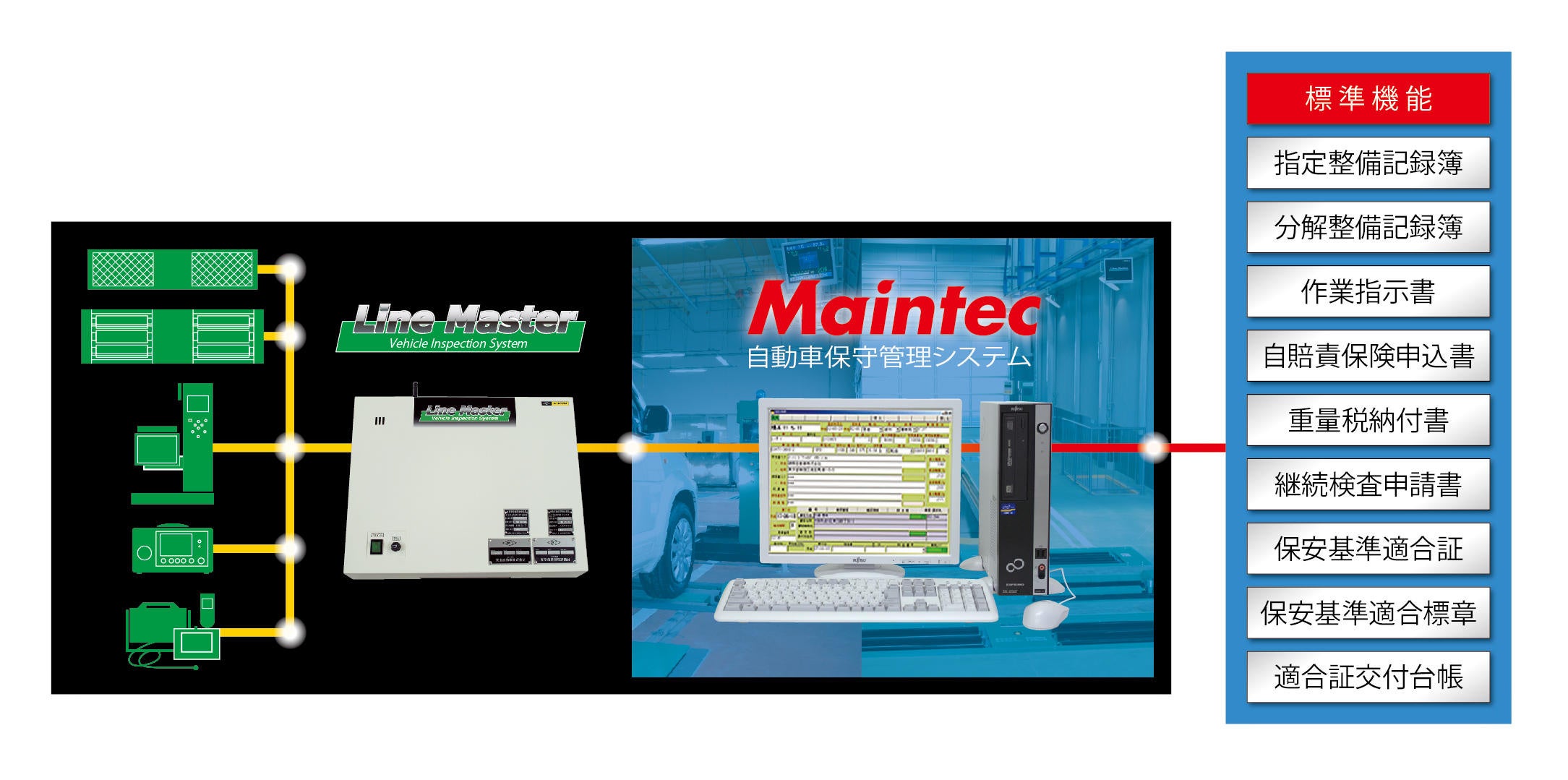 トータル車検ラインシステム“ラインマスター”のフロント業務ソフトとして、ユーザー・車両管理はもちろん、指定整備記録簿をはじめとした官辺書類を発行することができます。