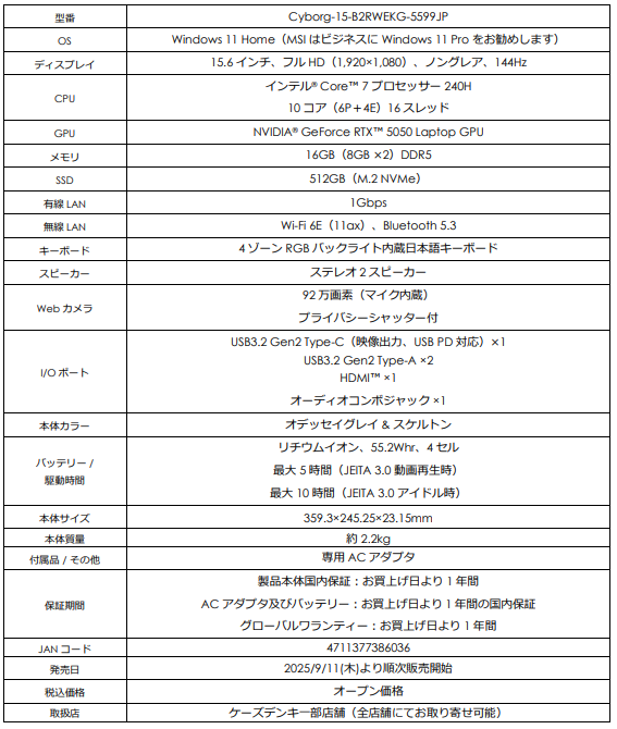 この度、エムエスアイコンピュータージャパン株式会社は、「Core 7」「RTX 5050」「メモリ 16GB」「144Hz ディスプレイ」を搭載し、あらゆるジャンルのPCゲームを快適プレイできるゲーミング性能に加え、ビジネス・クリエイティブ・マルチメディアなど幅広い用途で高速・快適動作を可能にするハイスペックゲーミングノートPC「Cyborg-15-B2RWEKG-5599JP」を2025年9月11日(木)より順次発売いたします。