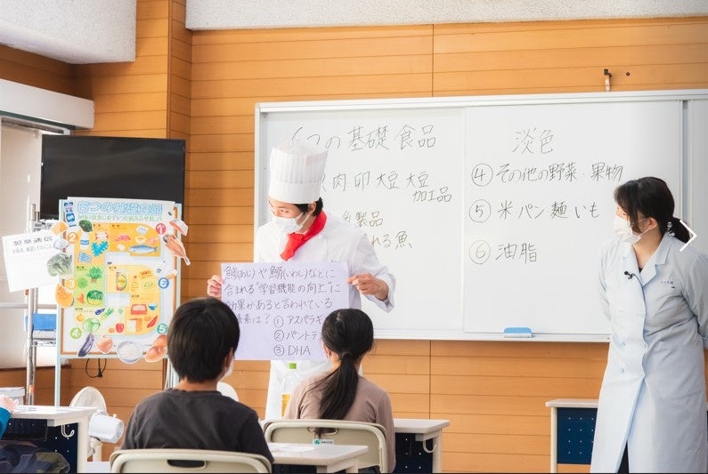 また、午前中にさばいたアジとイワシは一般的に青魚と呼ばれており、脳の働きをスムーズにする「DHA」という栄養素が摂れることを紹介し、魚の持つ魅力を栄養素の観点から子どもたちに教えました。その後は、学んだことをクイズでおさらい、子供たちは見事に全問正解し、魚の大切さについて理解を深めました。最後に大川先生は「大人になると好きなものが好きなだけ食べられるようになり、必要な栄養素が欠けてしまうことがあります。一日トータルでいいので、6大栄養素をバランスよく獲れるように心がけてください」と締めくくりました。