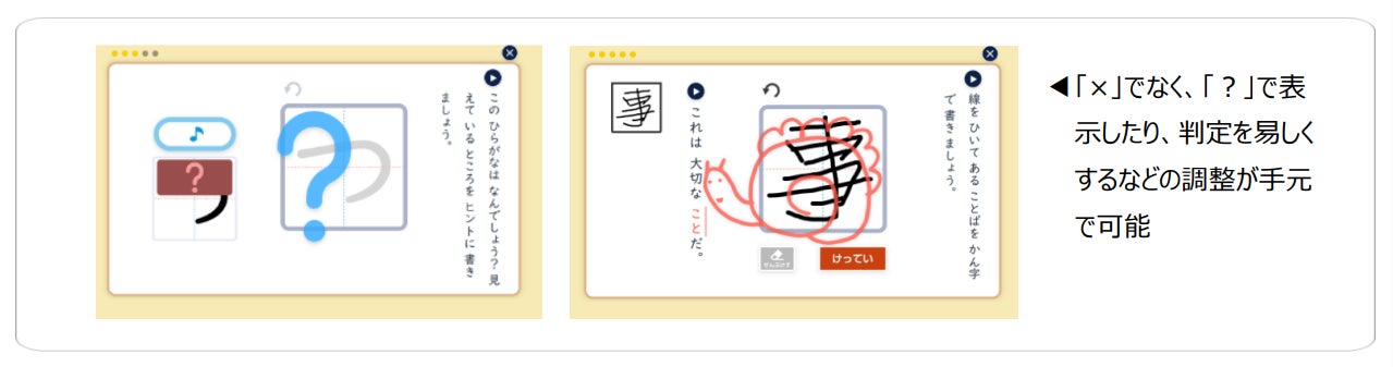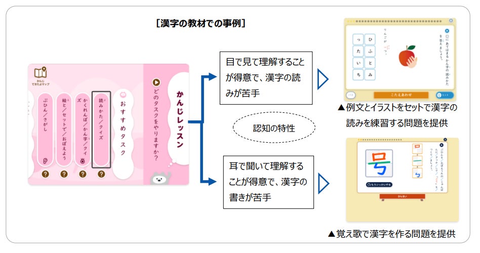 タブレット学習用の教材は、事前チェックテストを行ったうえで、「目で見て理解することが得意で、漢字の読みが苦手」「耳で聞いて理解することが得意で、漢字の書きが苦手」などの個々の特性に合わせ、取り組みやすく個別最適化された学び方での学習素材が提供されます。そして、この教材を、専門的な研修を受けた講師による、双方向型でやる気を引き出すオンライン個別指導※1によるサポートを受けながら取り組みます。お子さまの読み書きのニガテと特性によりそいながら、無学年で読み書きという「学びの基礎スキル」を育んでいきます。