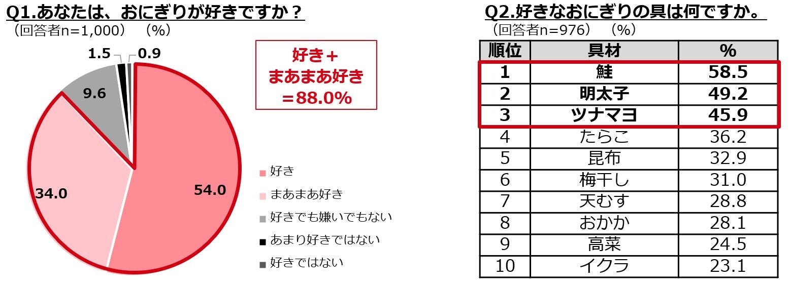 ・おにぎりが好きな人は約9割。好きな具は「鮭」「明太子」「ツナマヨ」がTOP3。