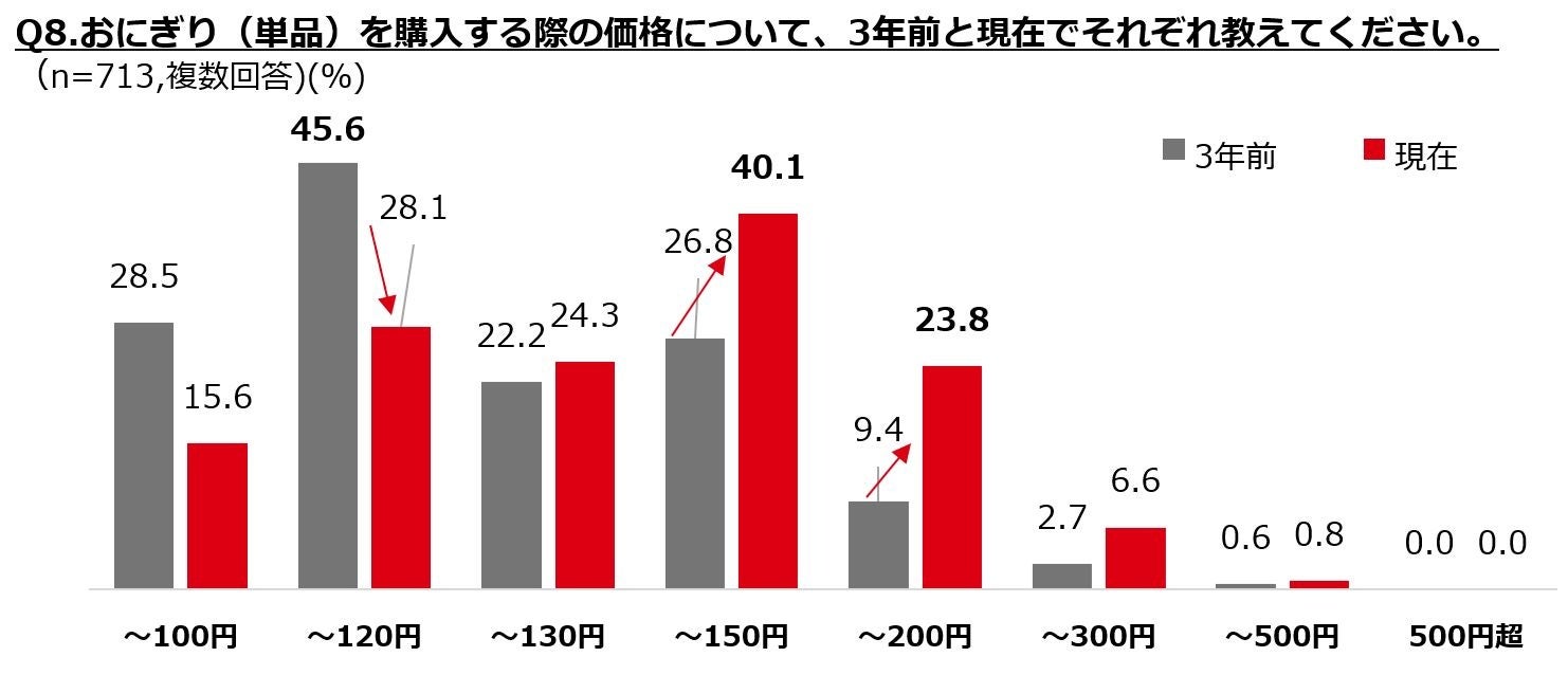 ・購入単価は、3年前は「~120円」が最多だったのに対し現在は「~150円」が最多。また「~200円」も9%→24%へと伸長。