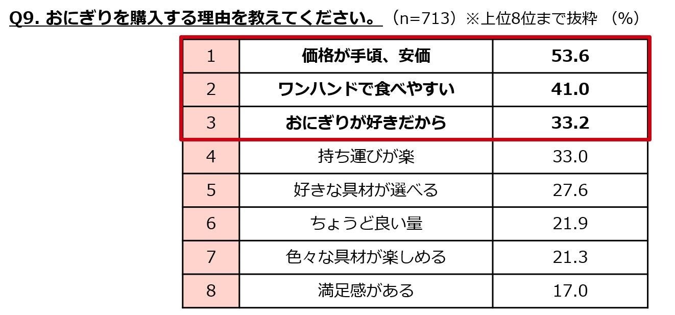 ・購入理由は「価格が手頃、安価」がトップで、次いで「ワンハンドで食べやすい」。