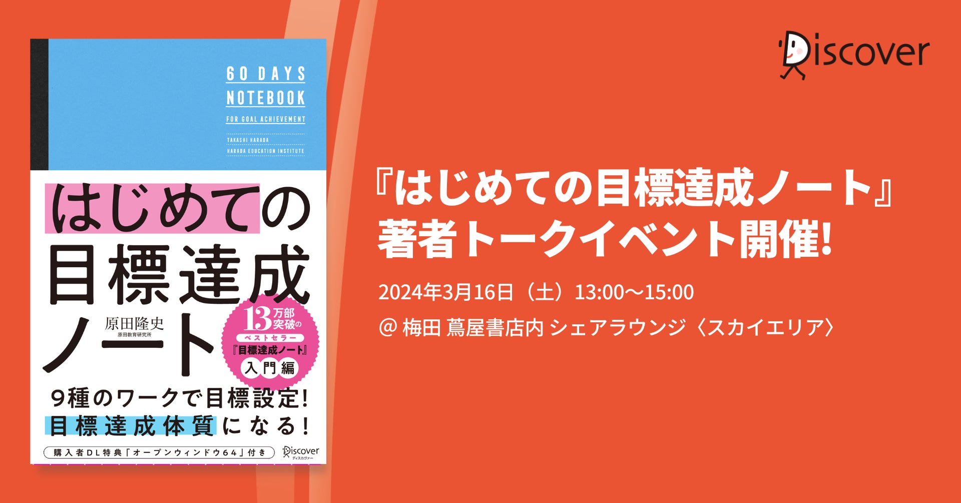 株式会社ディスカヴァー・トゥエンティワン(本社:東京都千代田区、取締役社長:谷口奈緒美)刊行の『はじめての目標達成ノート』著者・原田隆史氏が登壇するトークイベントが、2024年3月16日(土)に梅田蔦屋書店シェアラウンジにて開催されます。