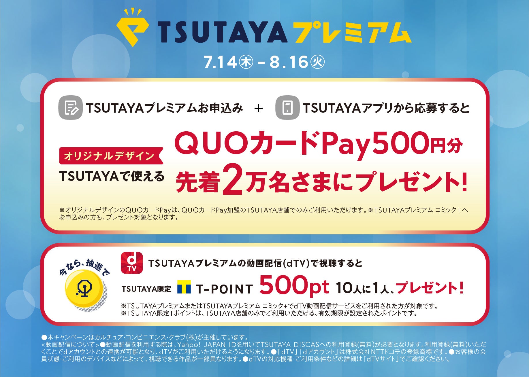 ■内容:キャンペーン期間内に、対象店舗で「TSUTAYAプレミアム」または「TSUTAYAプレミアム コミック+」へお申込みいただき、TSUTAYAアプリから応募すると、先着2万名様にオリジナルQUOカードPay500円分をプレゼント!