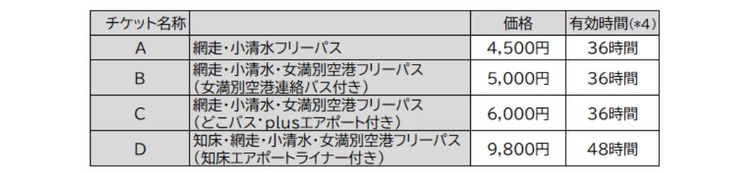 ■「網走&小清水&知床ぐる旅パスポート」概要(4種類)