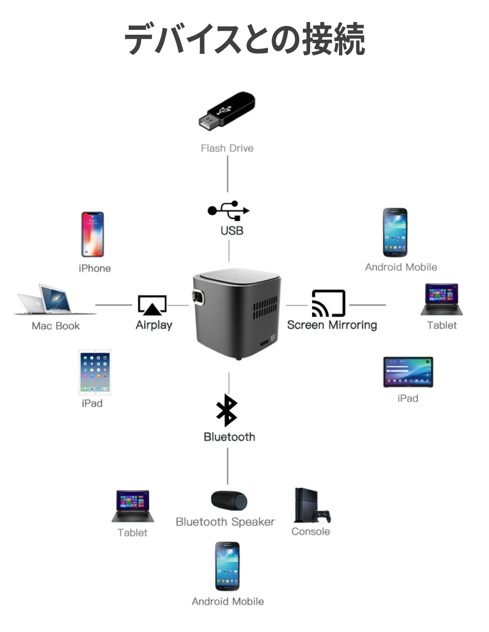 AirPlay、Miracastに対応し、スマホの画面を直接投影できます! iPhoneとAndroid対応。
