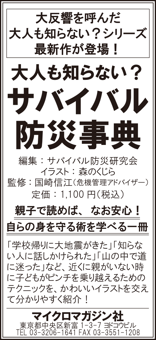 マイクロマガジン社(東京都中央区)は、『大人も知らない? サバイバル防災事典』を3月11日の岩手日報・福島民報・福島民友新聞に掲載いたしました。