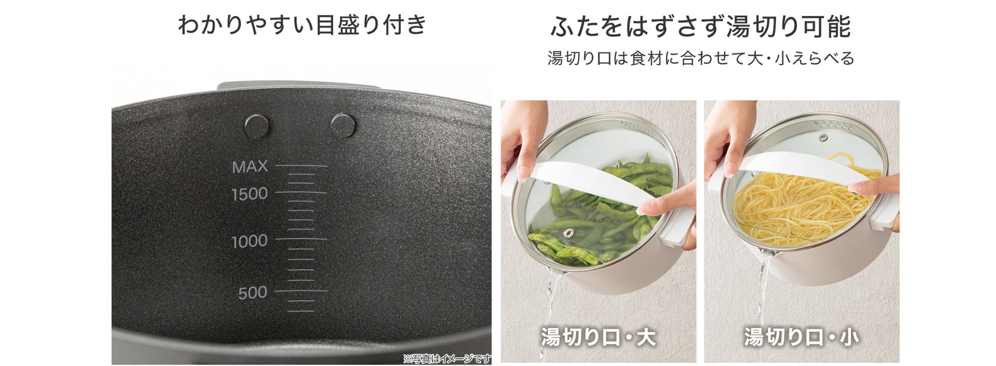 なべには300mL~1800mLまで100mL単位の目盛りがついていますので、計量カップで水の量を計る必要はありません。また、食材の大きさに合わせて湯切りできるように、ふたには大小の湯切り穴をつけていますので、パスタや野菜を茹でた後にざるを用意する必要もありません。洗い物を増やさずに調理ができます。
