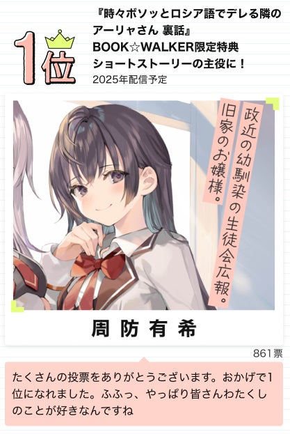 また1、2位のキャラクターは副賞として、【作者書き下ろしBOOK☆WALKER限定特典ショートストーリー(以下、SS)】の主役に抜擢されることが決定しており、2025年発売予定の『時々ボソッとロシア語でデレる隣のアーリャさん 裏話』の限定特典SSには「周防有希」編、10巻の限定特典SSには「アリサ・ミハイロヴナ・九条(アーリャ)」編が収録予定となります。