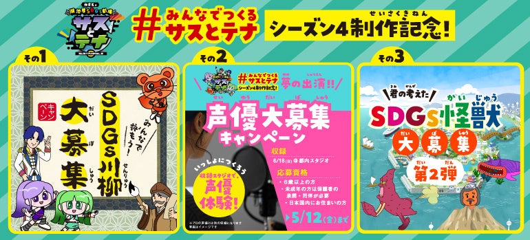 2023年7月からは新シリーズ(シーズン4)の放映を予定しておりますが、シーズン4では、視聴者のみなさまとともにアニメの制作を進めたいとの想いから、「#みんなでつくるサスとテナ」をテーマに、『アニメ内で紹介される川柳/アニメにご出演いただく声優/アニメ内で紹介されるSDGs怪獣』をそれぞれ募集する企画を実施します。