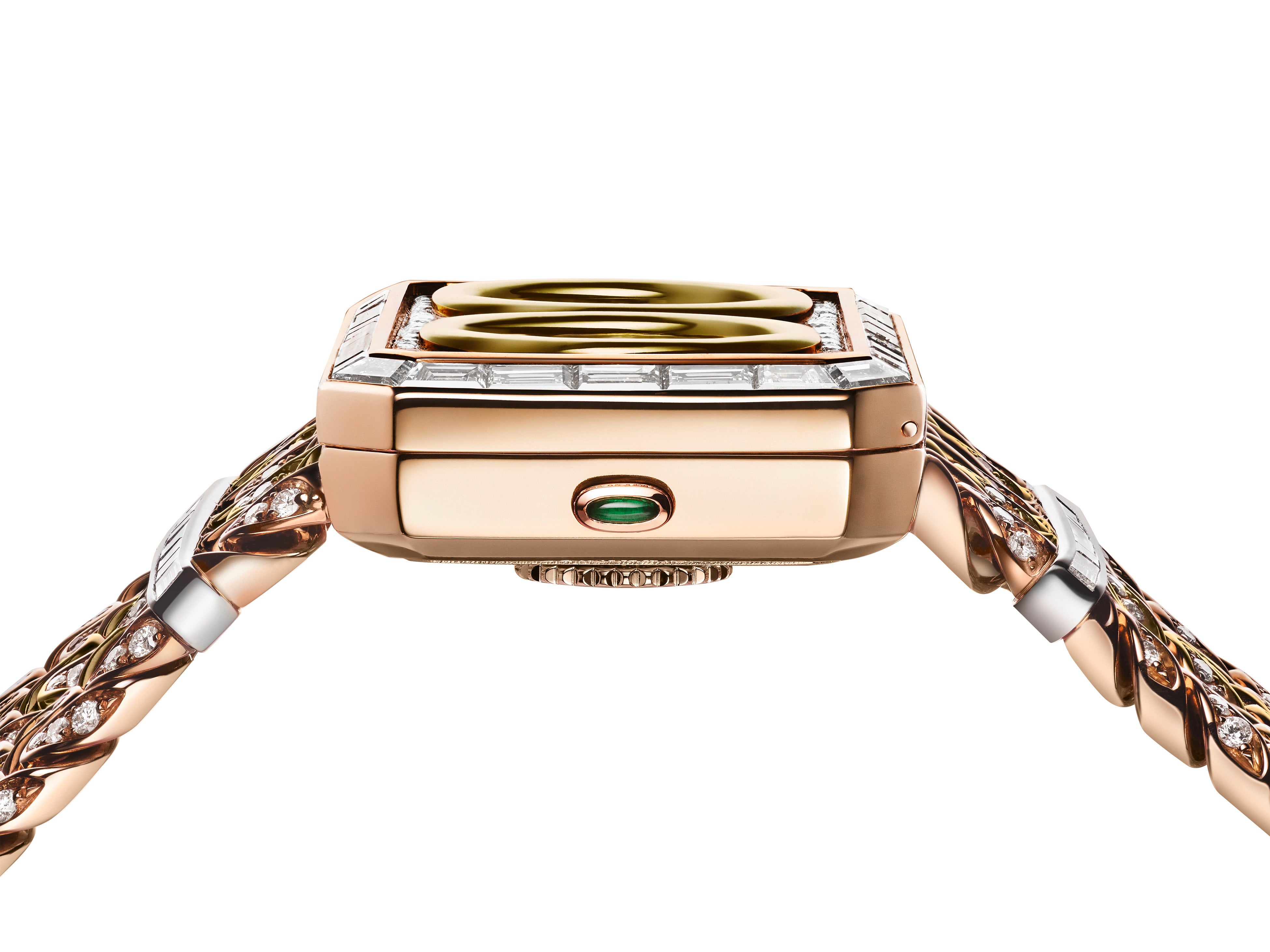 「モネーテ カテーネ」は洗練された魅力と卓越した美学によりゴールドとダイヤモンドで形作られた、重厚なボディを持つタイムピースです。そして巧みな技術で作られたケースに古のコインが収められています。「モネーテ カテーネ」のケースは、かつての「オクト モネーテ」のウォッチのように8つのファセットで構成されたデザインです。ブルガリが大切に守ってきた力強い象徴性を持つこの幾何学的な形はローマにあるマクセンティウスのバシリカの天井を思い起こさせます。同じく洗練されたデザインの「モネーテ カテーネ デュアルタイム」は1970年代にローマン メゾンがデザインした長方形の時計からインスピレーションを得ています。2色の針を配した2つのダイヤルが異なるタイムゾーンの時刻を表示します。コインを取り囲むイエローゴールドとピンクゴールドの組み合わせは当時の特徴でもあった2つのトーンの輝きを表現しています。ジュエリー作りの専門技術が詰め込まれたこのウォッチにはバゲットカットとブリリアントカットのダイヤモンドがあしらわれ、繊細なスノーセッティングが施されています。ケースの側面にはブルガリの証である2つのカボションカットのエメラルドが配されておりこの「鍵」でケースを開けると、中に隠れていたダイヤルが輝きを放ち姿を現す仕組みです。