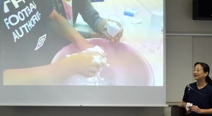 最後に、日焼け止めも必要がなくなれば、肌の「異物」になることを説明しました。塗っておく必要が無くなったら、しっかり洗浄剤で落とすことが重要であること、そのポイントとなるのが、「摩擦」と「温度」であることを紹介。ともに肌のストレスになるもので、肌に負担を与えてしまうことから、洗浄剤をしっかり泡立てて肌の負担となる「摩擦」がなく、肌に快適な「温度」のぬるま湯で穏やかにやさしく落とすことが大切であることを説明しました。その後、みんなで実際に洗浄剤を泡立て、日焼け止めを洗い流しました。