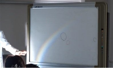 毎日の生活で浴びる紫外線。太陽光に見立てたスポットライト光を、水を入れた水槽に当てることでホワイトボードに虹を描き、紫外線はどこにあるのかをみんなで考えました。紫外線が紫の外側(写真丸部分)にあることを知ると、お子さんからは「紫外線は見えないんだ!」と声があがり、新しい気づきに目を見張っていました。
