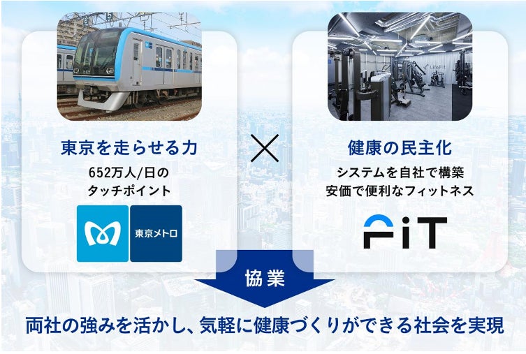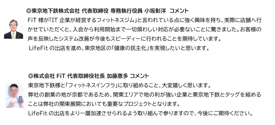こうした背景を踏まえ、今回、東京メトロはFiTが提唱する「健康の民主化」の必要性に共感し、両社でフランチャイズ契約を締結、1号店として「LifeFit 葛西駅店」を開業する運びとなりました。今後は、両社の強みを活かし、気軽に健康づくりができる社会を常識とすることで、「健康の民主化」の実現に向けた取り組みをさらに推進してまいります。