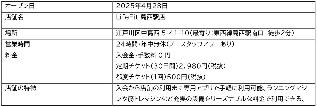 東京地下鉄株式会社(本社:東京都台東区、代表取締役社長:山村 明義、以下「東京メトロ」)はフィットネスジム「LifeFit」を運営する株式会社FiT(本社:京都府京都市、代表取締役:加藤 恵多、以下「FiT」)とフランチャイズ契約を締結し、24時間・無人フィットネスジム事業に参画いたします。本契約に基づき、4月28日(月)に「LifeFit」フランチャイズ1号店を東西線葛西駅付近に開業いたします。